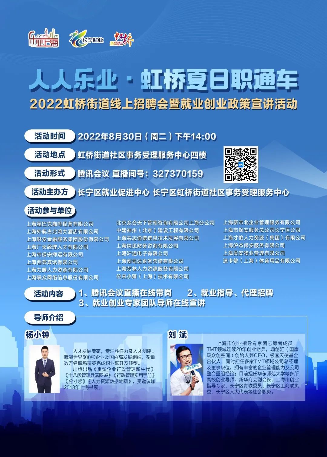 如你有就业创业需求,可以不出家门,在线上投递简历、视频面试、对话高管……8月30日(周二)下午14:00,“人人乐业·虹桥夏日职通车”——2022虹桥街道线上招聘会暨就业创业政策宣讲活动即将启动。
