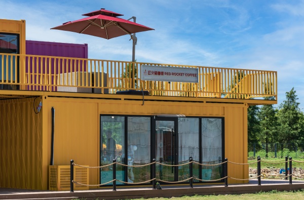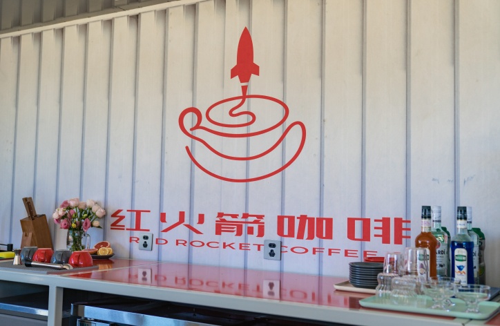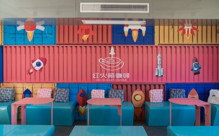 配合基地以魔盒为主的建筑风格,“红火箭”咖啡馆也建在魔盒里,面积约350平方米,馆内还设置了火箭、宇航员等航天元素。