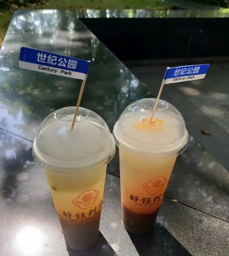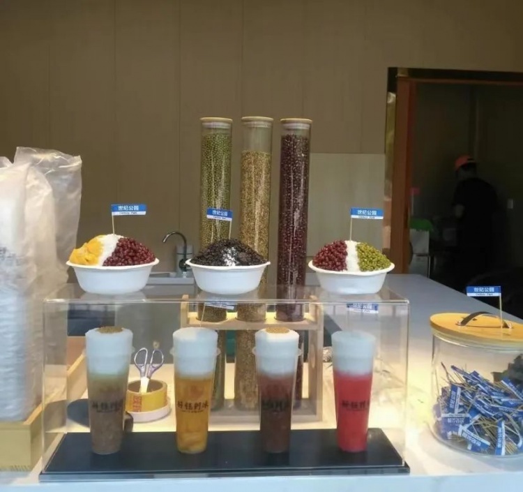 没有过多的花头作为渲染,底下铺一层绿豆,上面盖满老式刨冰的灵魂——粗冰渣子!再插上世纪公园的专属小牌子,一口下去嘴里嘎吱嘎吱作响,就是儿时最朴实无华的快乐!