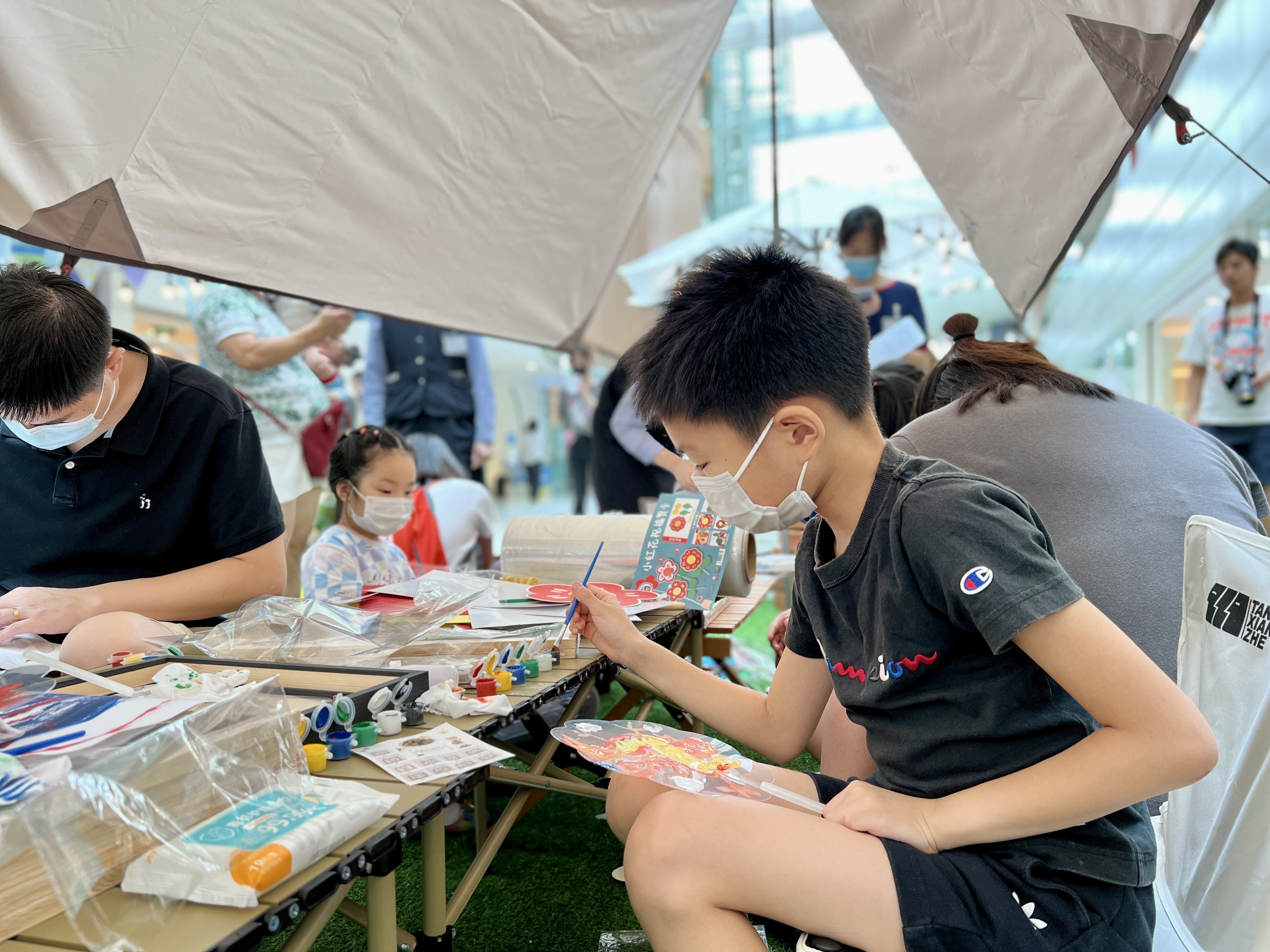 8月27日下午,不少小朋友和父母前来一同参与当天的亲子创意涂鸦活动。八岁的骏莛小朋友更是第一个到场,在领取画材后,骏莛小朋友充分发挥想象力,大胆运用颜料和画笔,在扇面上以“二龙戏珠”为主题进行创作。