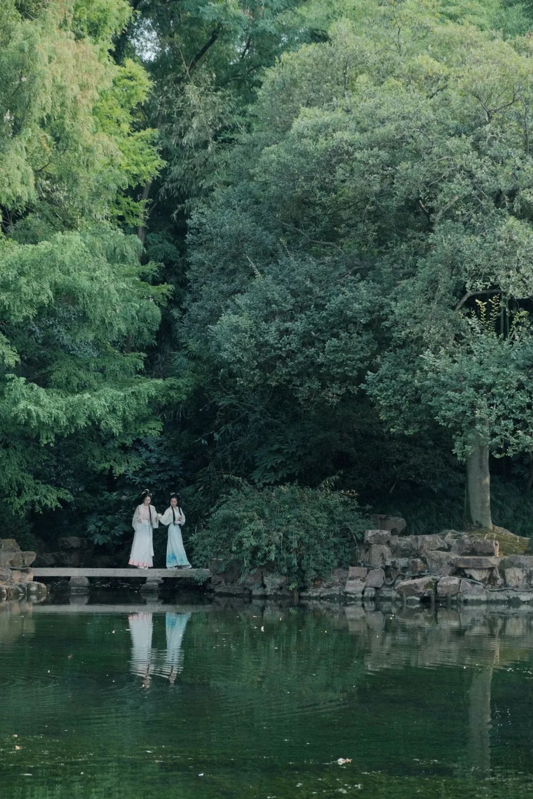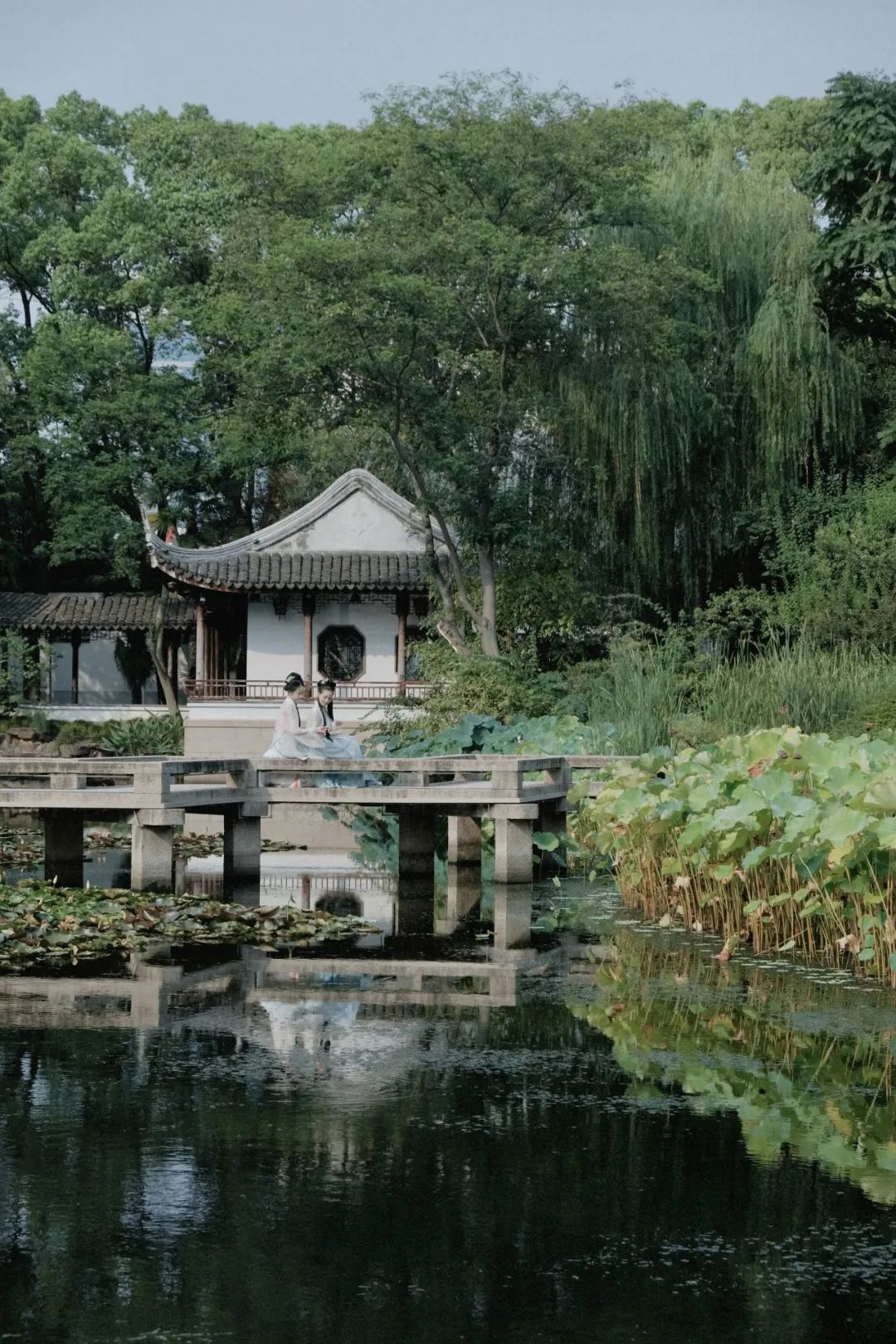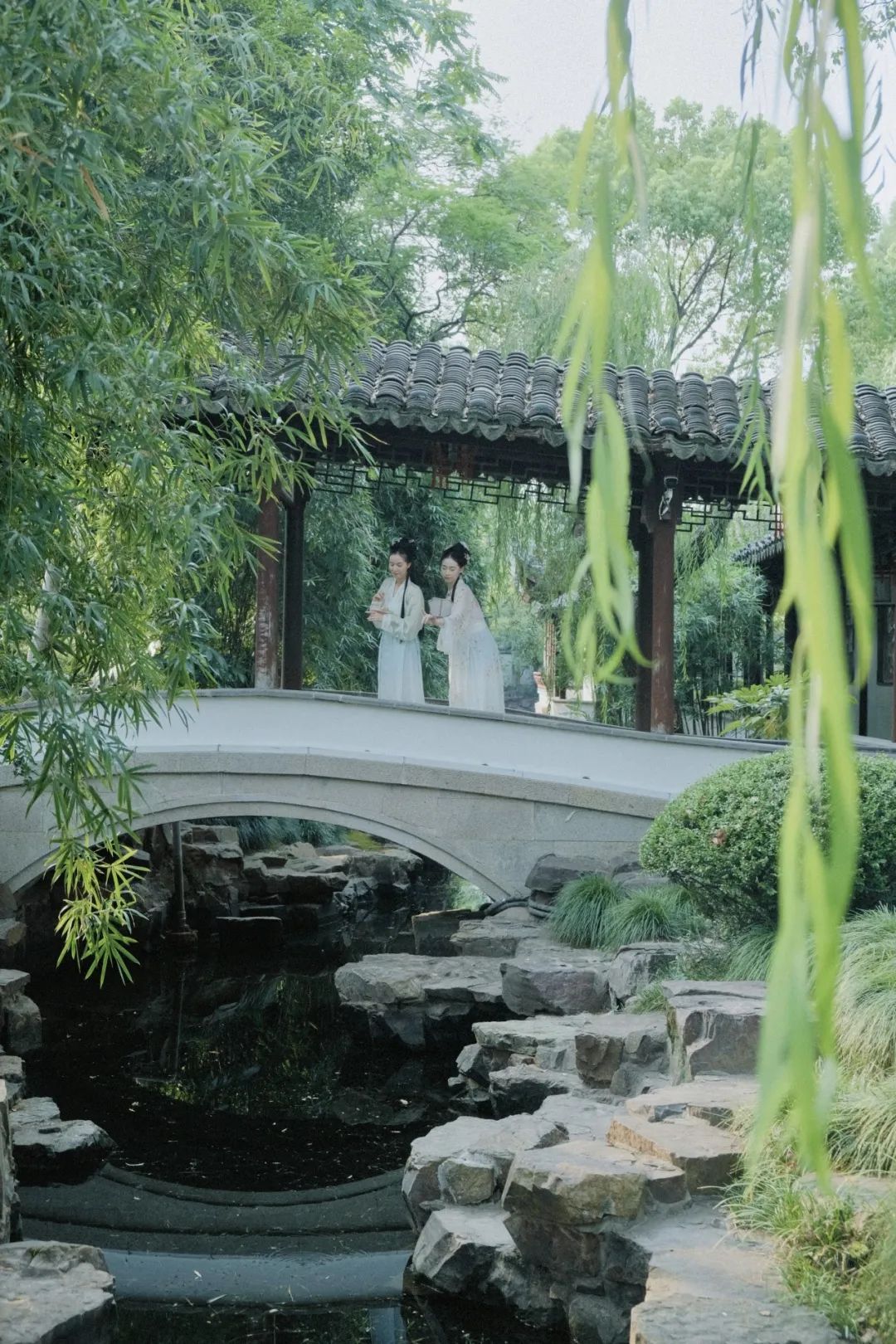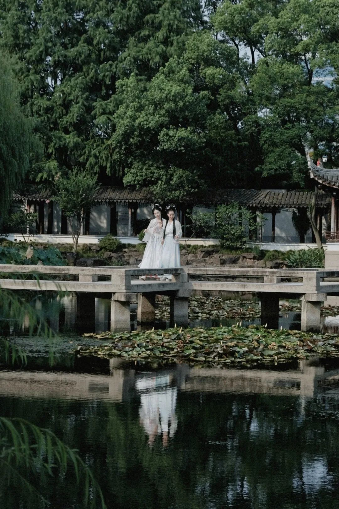 模特从九曲桥上走过,摄影师站在两边的凉亭内都可。