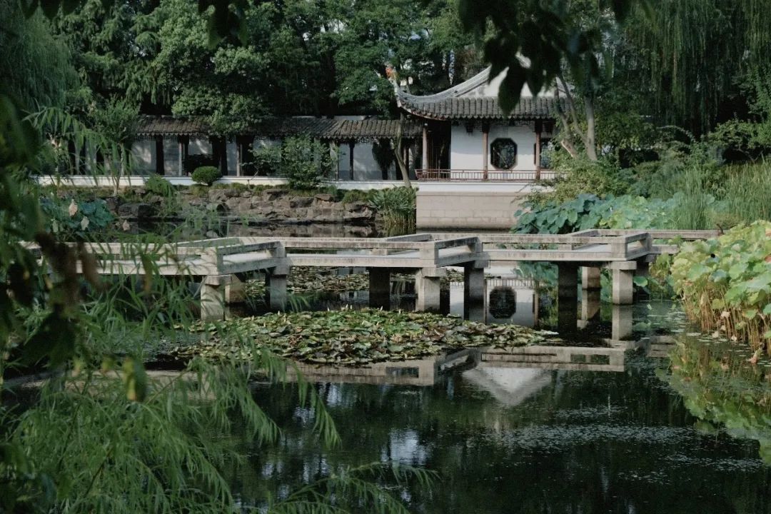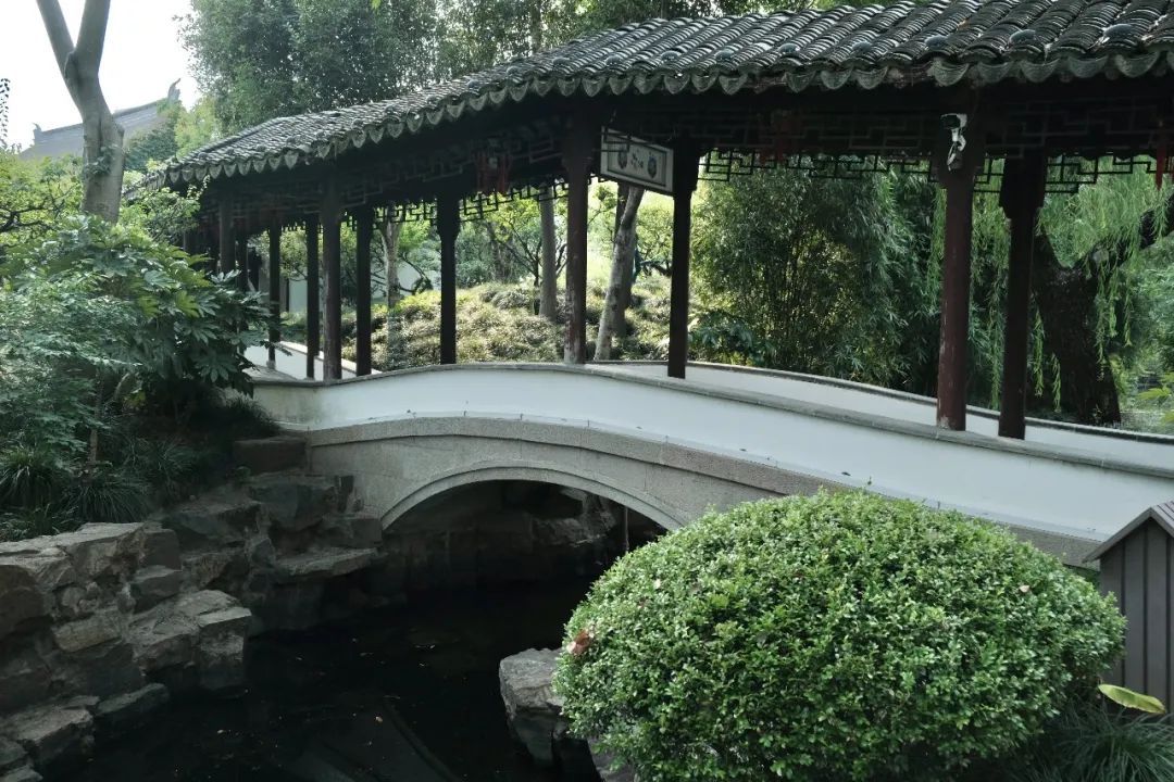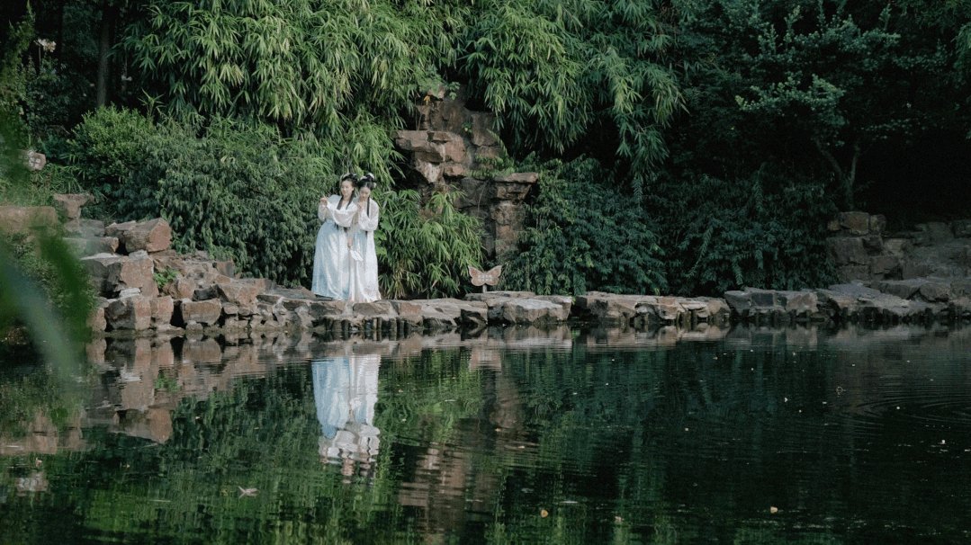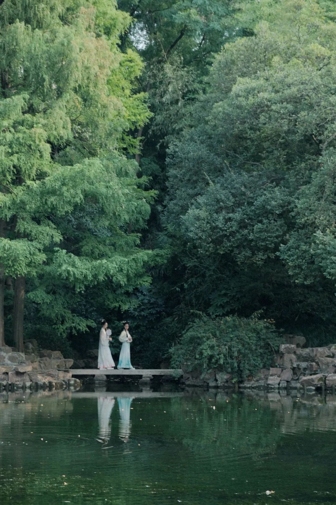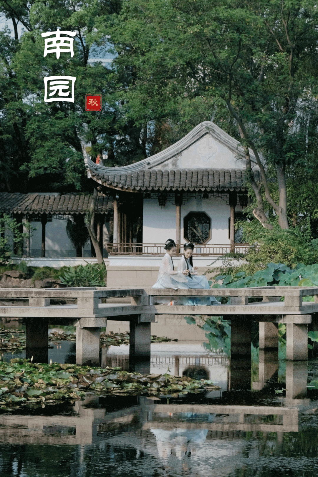 模特从九曲桥上走过,摄影师站在两边的凉亭内都可。