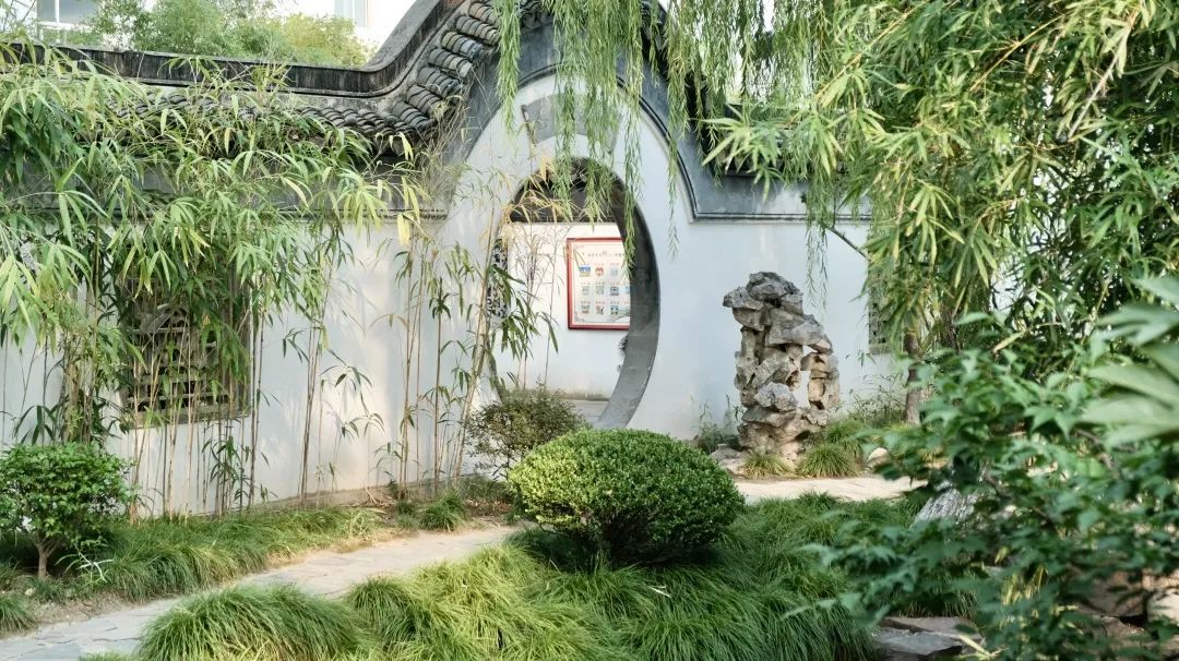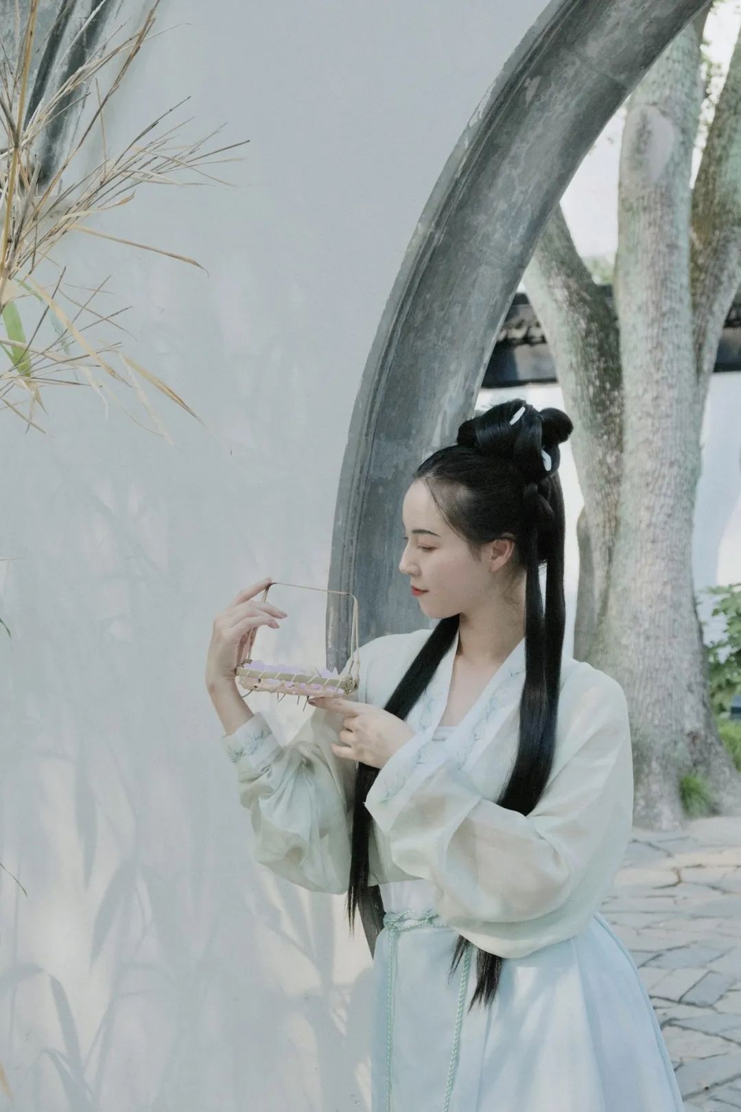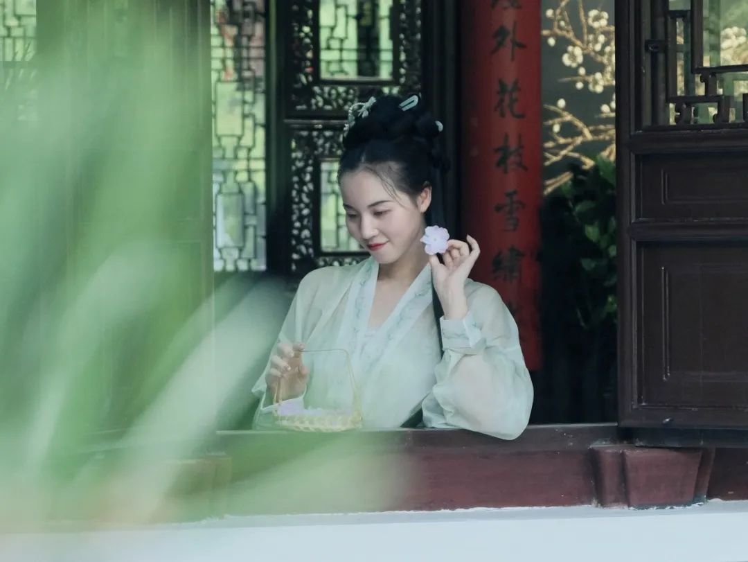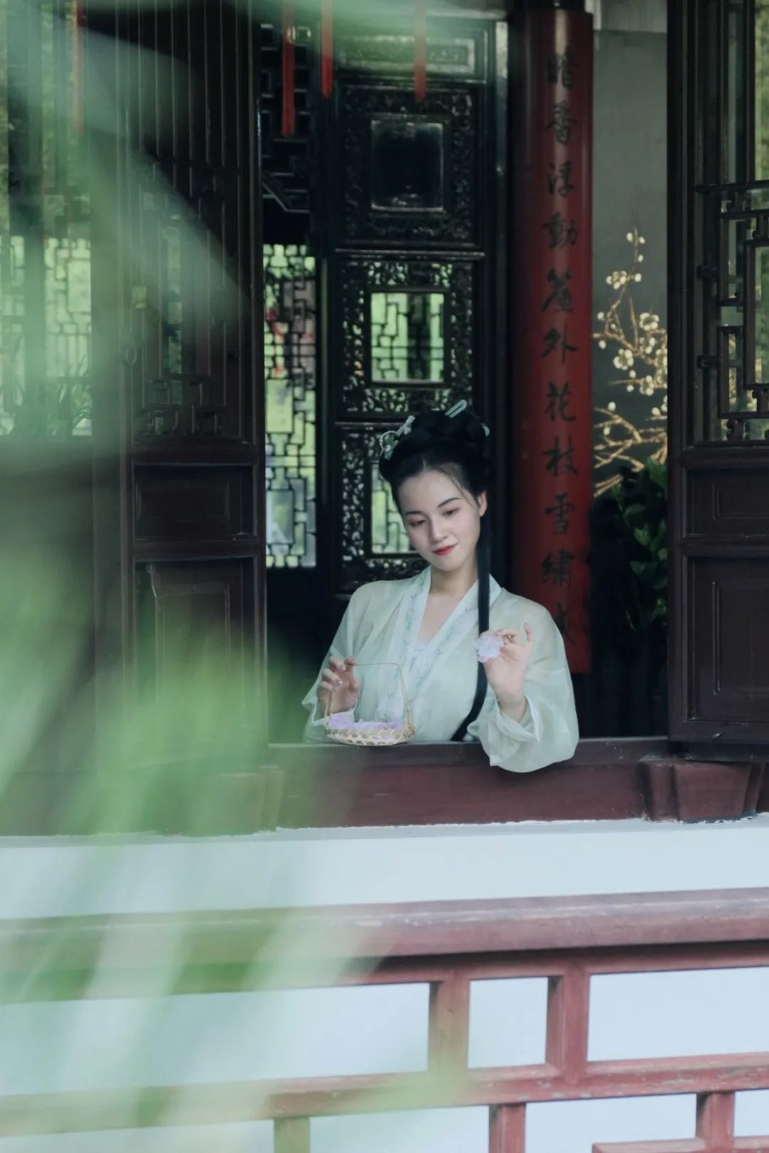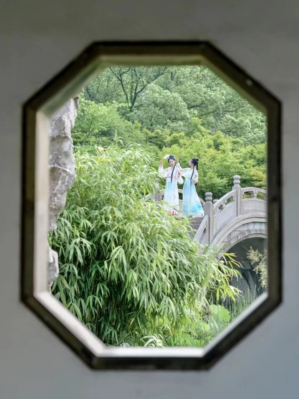 模特在窗框内,拍摄者站在院落内,可用树叶借景色。