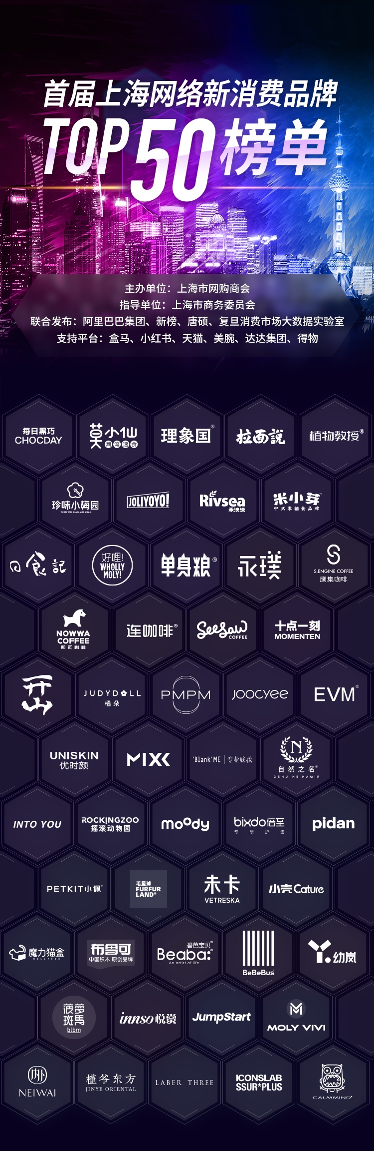 8月28日,在上海市数字生活节启动仪式上,上海市网购商会发布首届上海网络新消费品牌TOP50榜单,每日黑巧、莫小仙、理象国、永璞、PMPM、优时颜、moody、小壳、BeBeBus、魔力薇薇等网红品牌榜上有名。