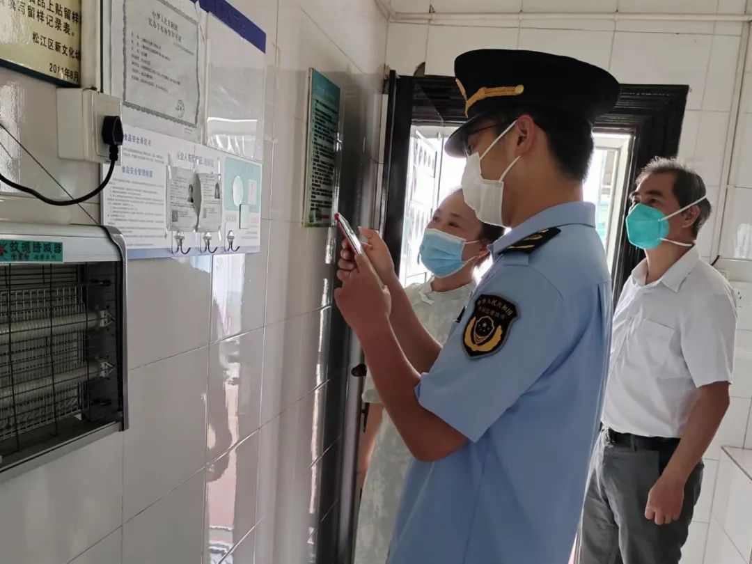 普陀:检查人员在华师大附小检查食堂从业人员健康证等信息。