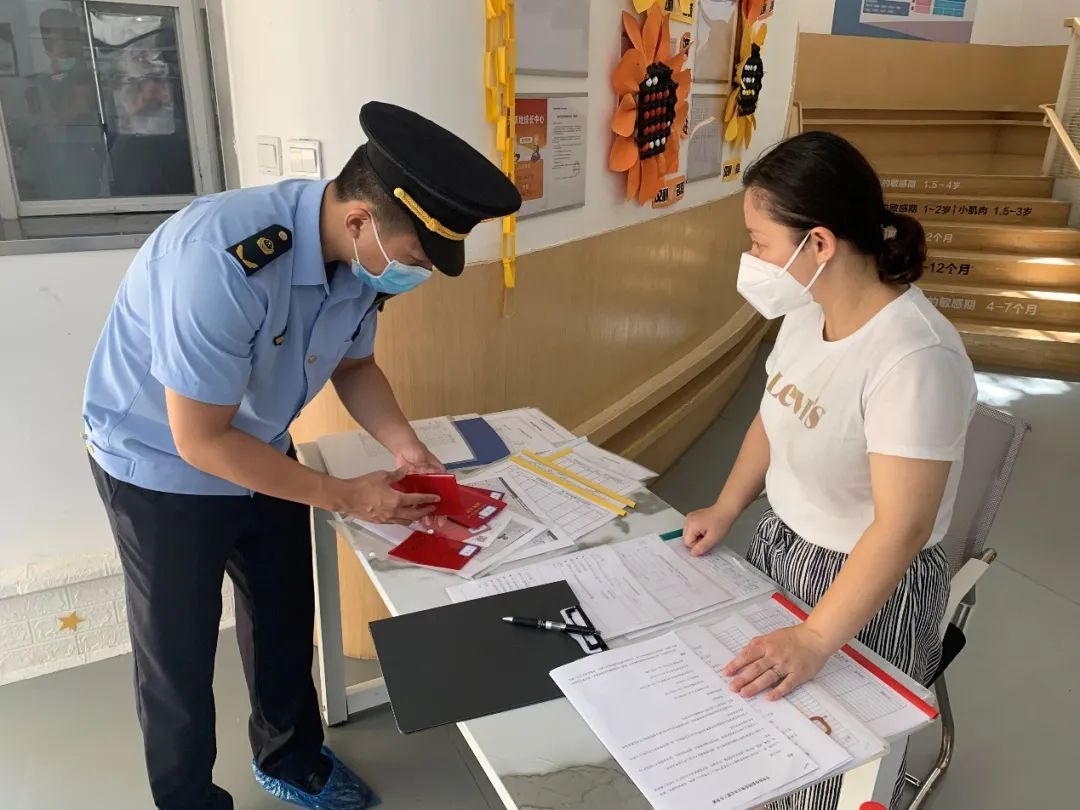 长宁:检查人员在芳草地成长中心查看保育员健康证。