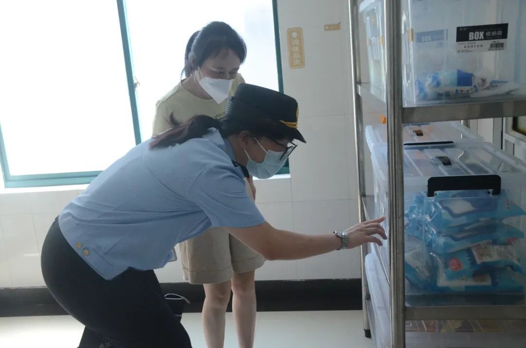 金山:检查人员在漕泾幼儿园检查仓库环境卫生及备用食品是否在有效期内等情况。