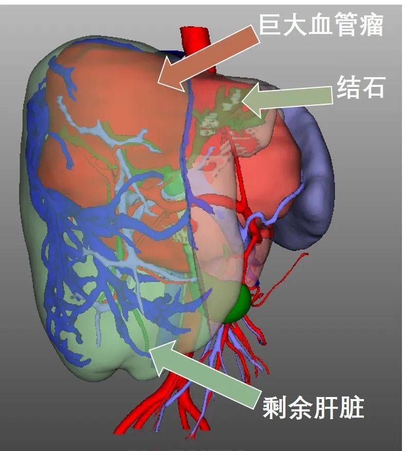 今年7月14日,张先生因腹胀伴反复高热(最高达到39°C)来到中山医院肝外科就诊。磁共振提示肝尾叶有巨大血管瘤(24.0×22.5×11 cm),严重压迫周围肝脏组织,肝内胆管内充满了结石,正常肝脏只剩下右叶一小部分。