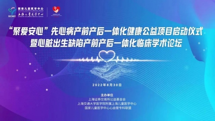 2022年8月30日,国家儿童医学中心(上海)、上海交通大学医学院附属上海儿童医学中心在上海证券交易所公益基金会的大力支持下,正式启动“聚爱安心”先心病产前产后一体化健康公益项目。