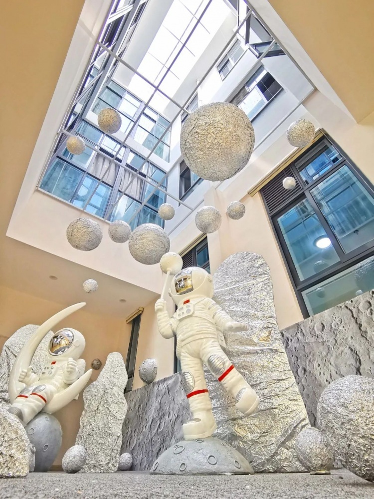 走进明亮的大厅,浓浓的宇航气息扑面而来,暖色调的迎宾墙上“观之入微,海阔鱼跃”八个大字阐释着办园理念。位于一楼的托班教室的布置以娃娃家为主题,小班教室里孩子们的可爱照片已被布置在点心吧里。9月1日,这里将迎来1个托班和4个小班共115名幼儿,开启全新的幼儿园生活。