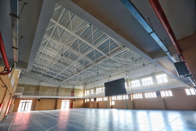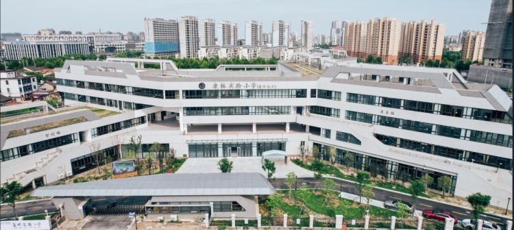 和一般小学E字形的建筑结构不同,这个校区的教学楼由多个“L”型建筑体块抽象、变形、翻转形成,从空中俯瞰宛如“大雁”,与周边社区河岸空间交融一体。康善、笃实、智创、慧德等四幢教学楼彼此相连,200米环道塑胶跑道、1个42米×25米足球场、2个室外篮球场、2个室外排球场,给予师生充分的户外运动空间。