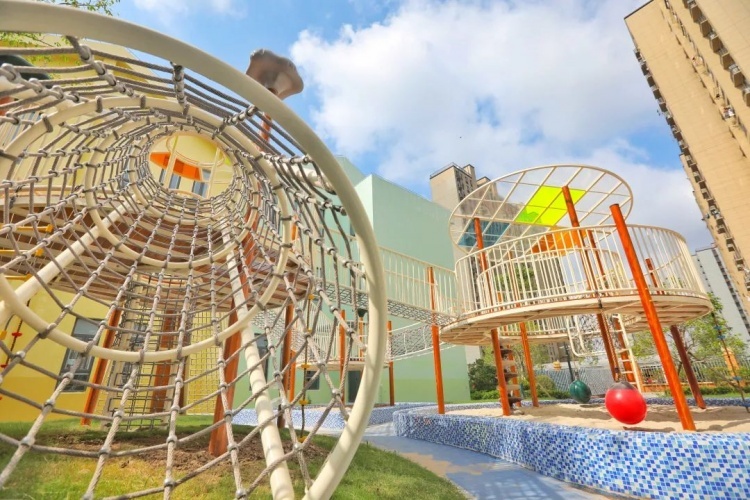 临河而建的马卡龙色建筑,黄蓝相间的星空操场,滑梯沙池一应俱全……新学年,惠南镇民乐社区的居民惊喜发现,家门口又多了一所漂亮的公办幼儿园——观海幼儿园(听晓校区)。