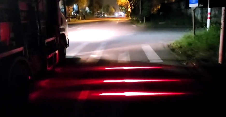 记者看到,该款警示灯由三条红色的箭头组成,在车辆右转弯时照射在车辆右侧转弯盲区的地面上,在地面上形成三条闪烁的光带,称为“闪烁斑马光带线”,警示路人车辆正在右转弯,请注意避让。