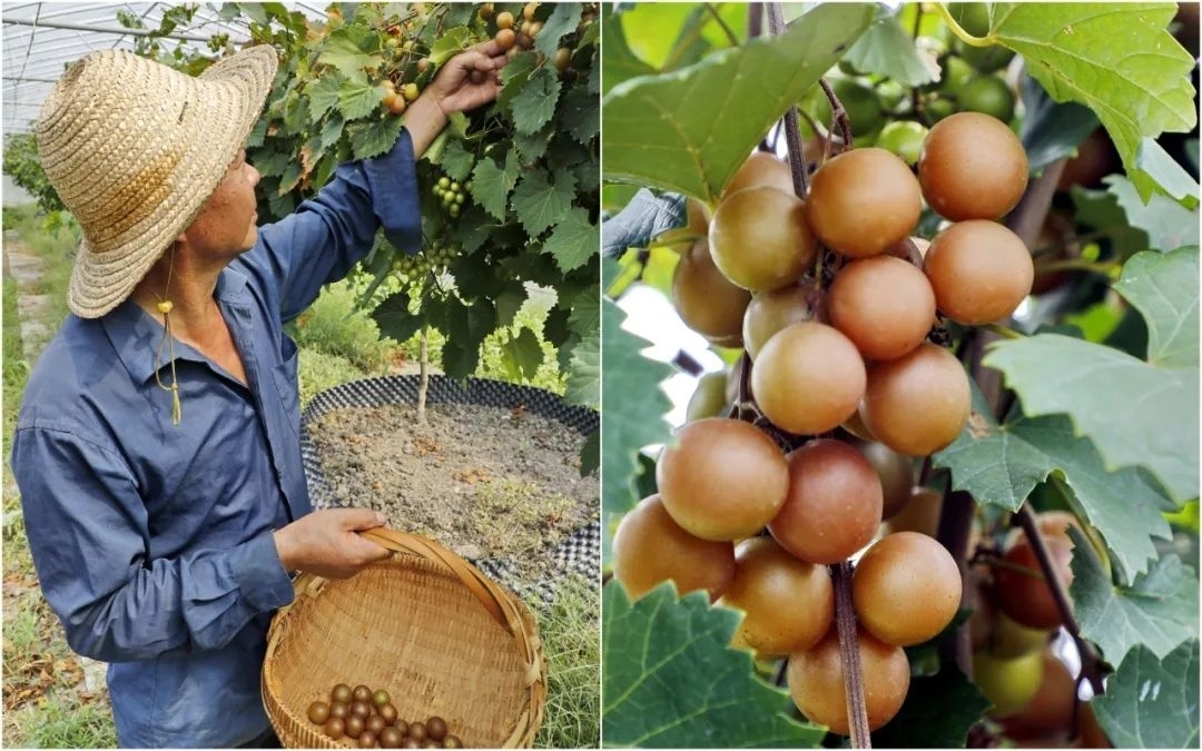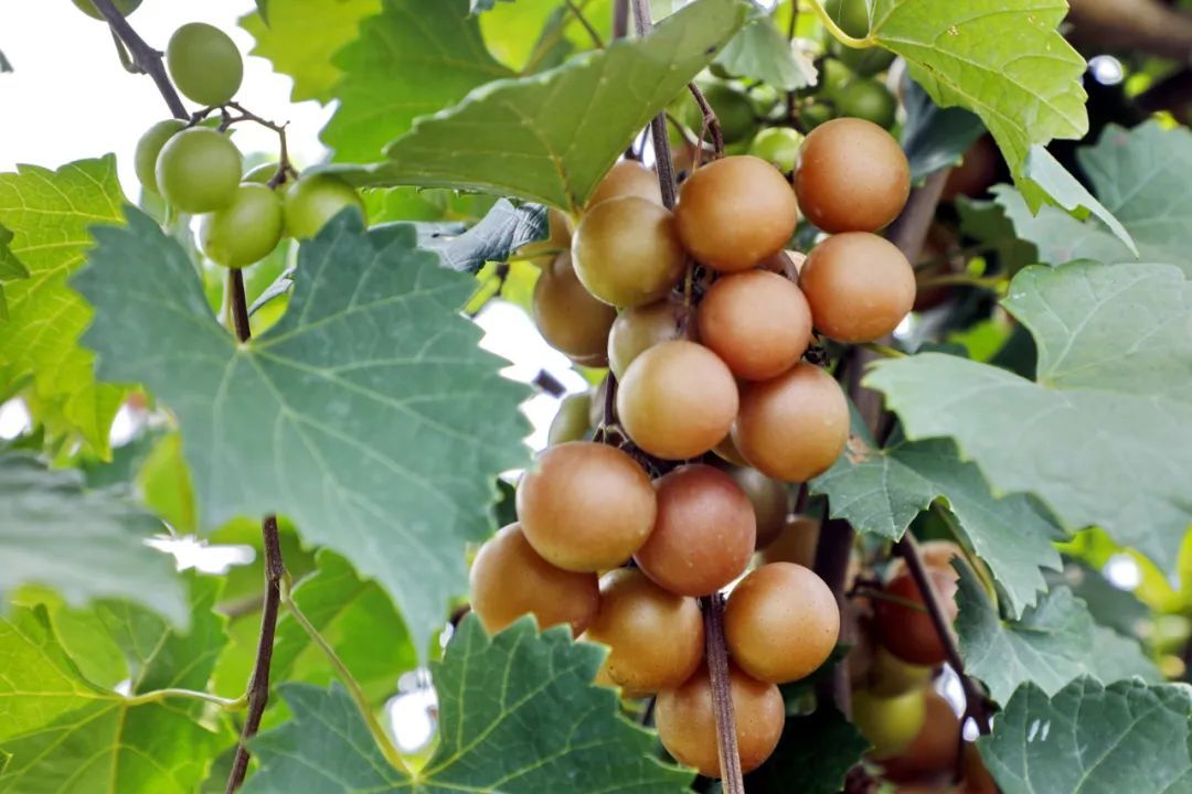 成熟的“马斯卡丁”葡萄外皮呈“古铜色”,带有浓浓的类似麝香的香味,个头略小于市场上主流的葡萄品种。咬上一口,