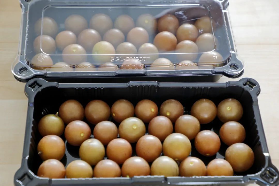 今年一共培育了16棵这样的“马斯卡丁”葡萄,产量大约是每棵树挂果上千粒,但优质果产量不是很高,葡萄现在是按颗卖的,一颗一颗嵌在泡沫盒里,价格在每颗5到7元。