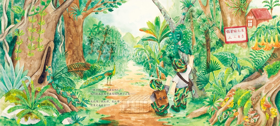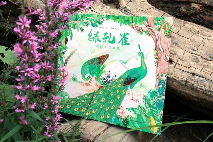 徐美玲介绍,原创绘本《绿孔雀:我的家在哪里》讲述了一只野生绿孔雀从破壳诞生到在种群中成长,再到经历一生中最大冒险,最后得到人类救助的故事。为了创作这本精美的绘本,云南画家杨思晴前期花了3个月的时间,深入森林和山谷进行资料收集和调研,记录植物的细节、动物的原有形态,尽可能地进行艺术性还原。“书中绿意盎然、生机勃勃的插画和曲折动人的故事,带领读者走进生物多样的热带季雨林。”徐美玲说。