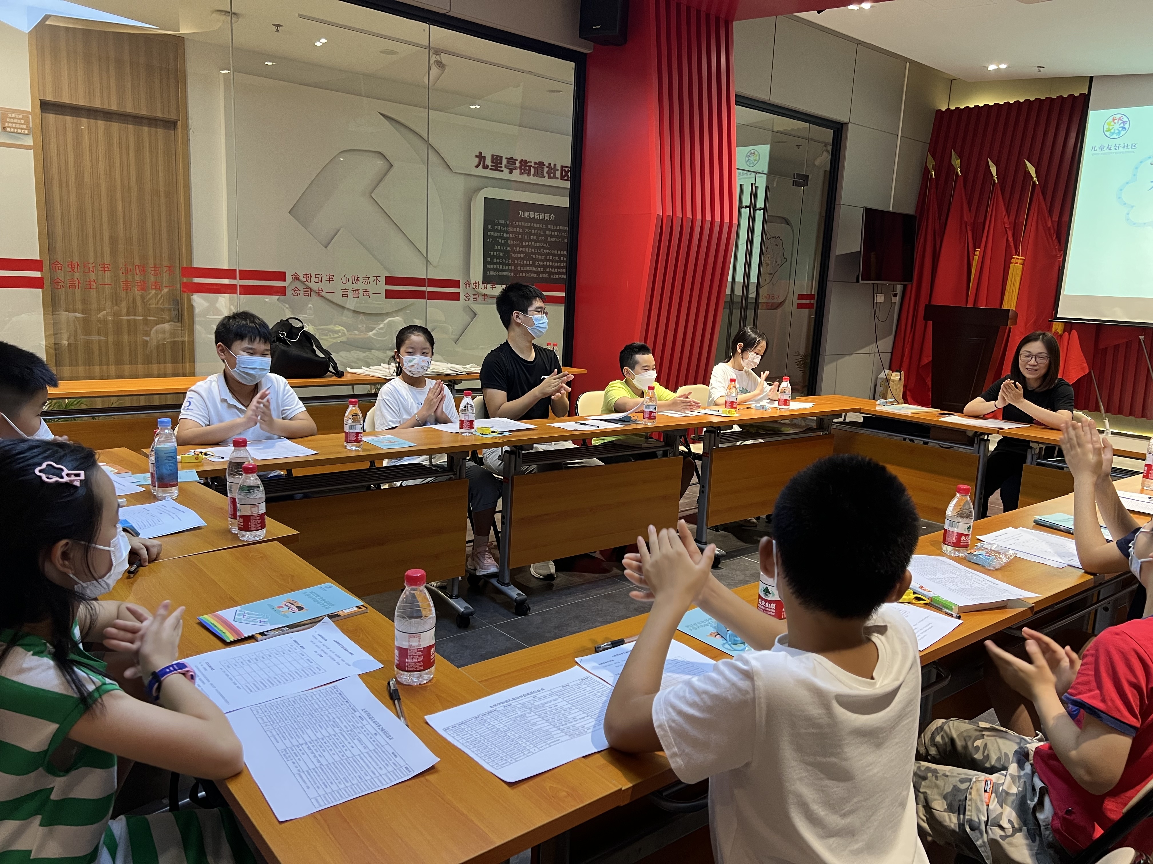 8月26日下午,在九里亭街道新时代文明实践分中心的红色礼堂内,来自九亭小学、九亭三小、九亭四小、九亭中学的13名社区儿童代表聚在一起畅所欲言,共议身边事、社区事。这是九里亭街道新一届“九里童声”儿童议事会成员们首次亮相。