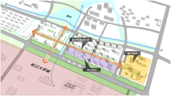 项目临近松江大学城区,结合松江大学城板块“南融北扩,东联西望”拓展目标,打造智慧办公+生态社区相结合的活力板块,形成居住区到教学区再到科创办公区的功能过渡,将教育力量无缝衔接到高新产业园,产学研融为一体。