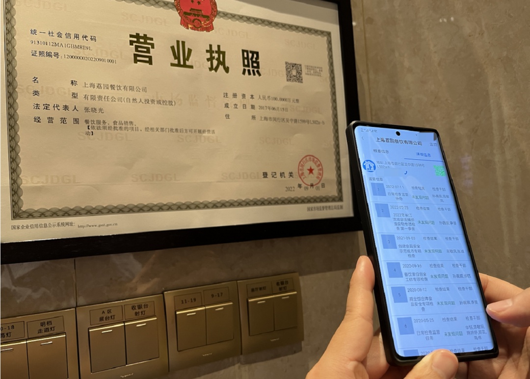 在徐汇恒悦轩(上海恒悦餐饮有限公司),消费者在点餐前,用手机扫描店铺悬挂的纸质执照上的“企业码”,登记信息、企业存续状态、许可证、监管信息等一一展现,清晰明了。