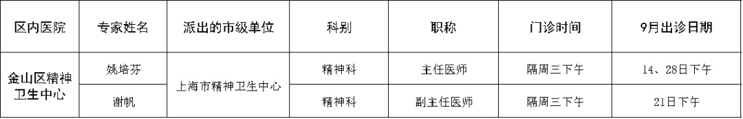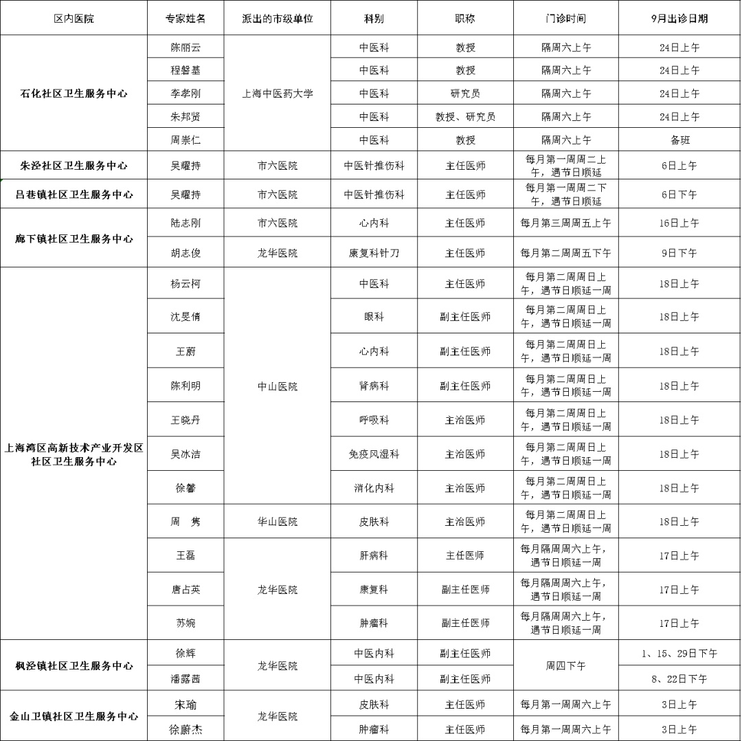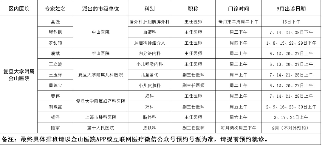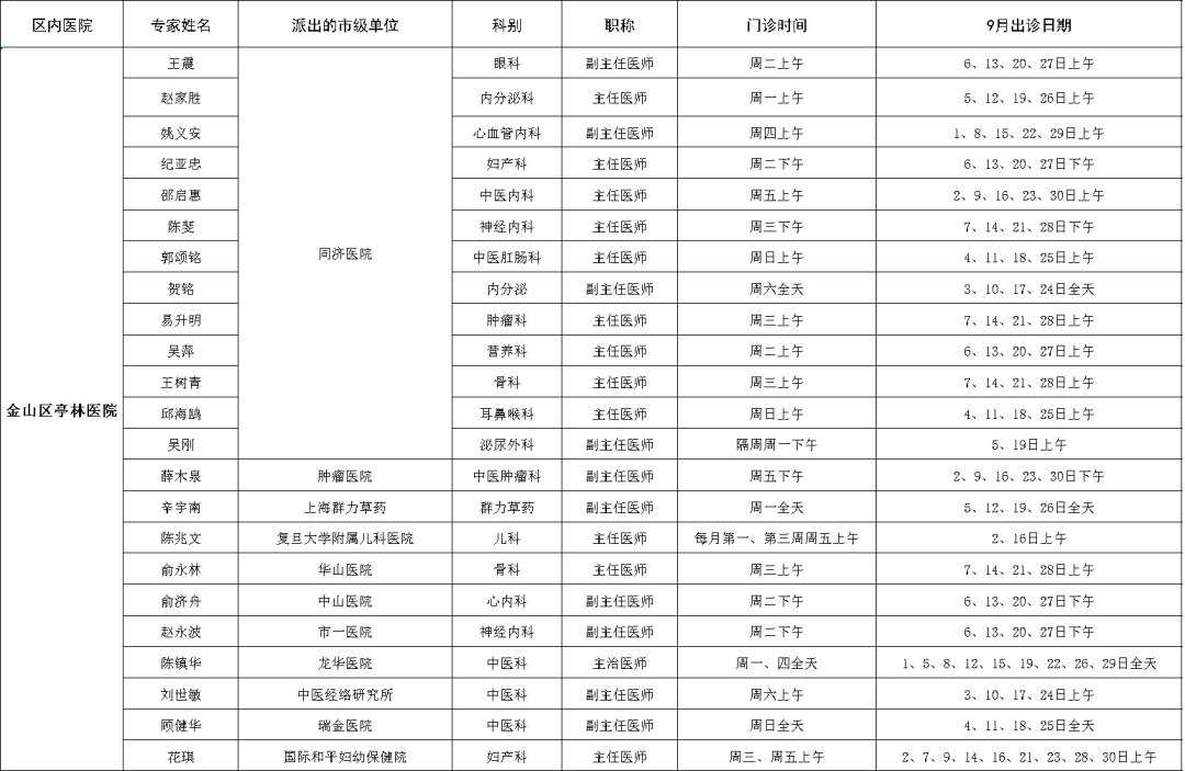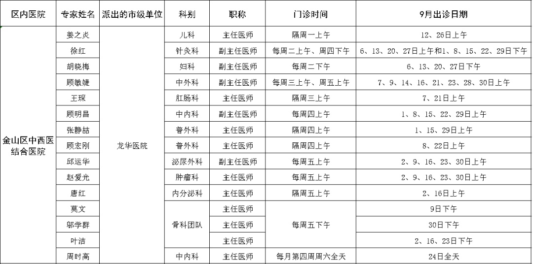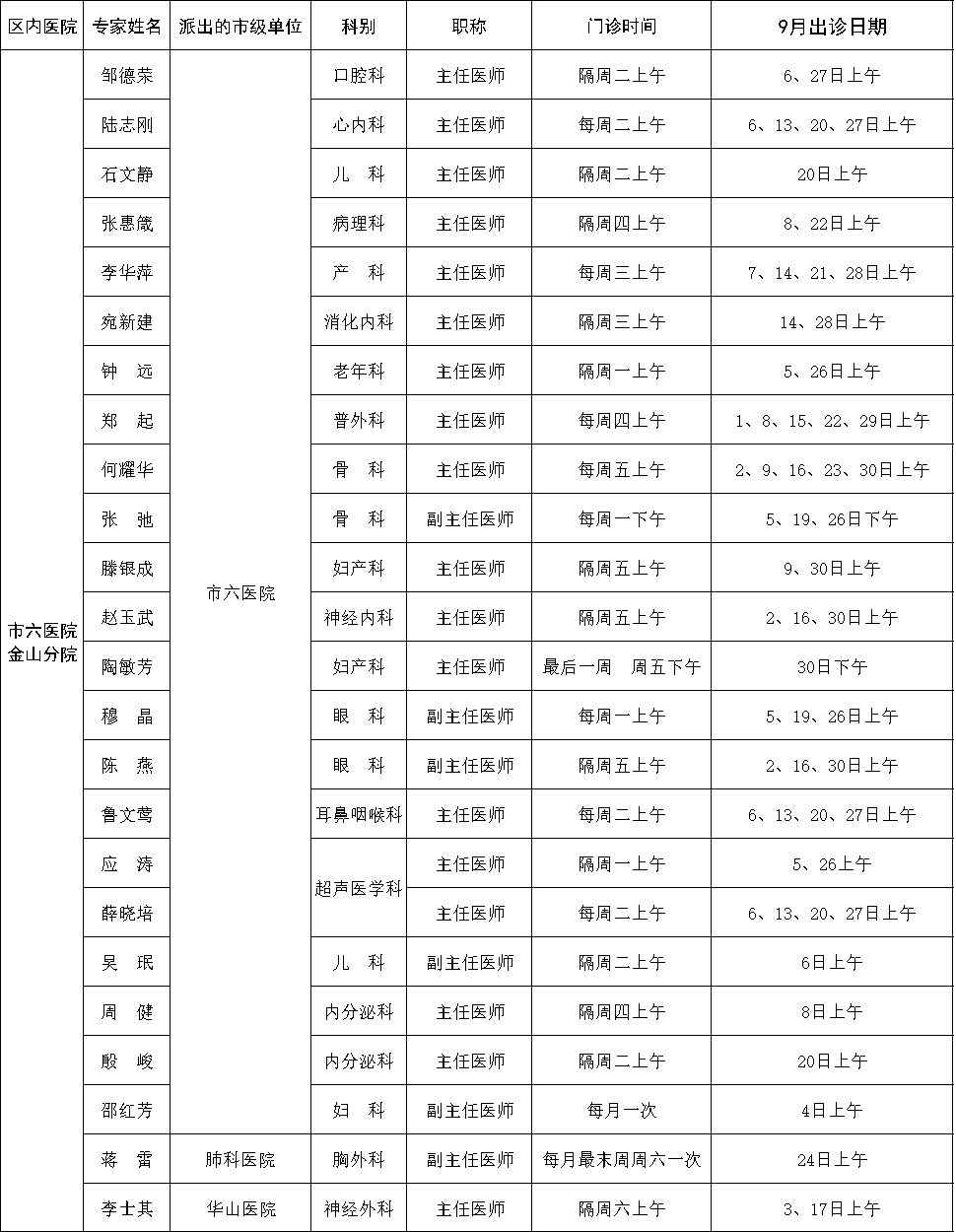 市级专家2022年九月出诊表