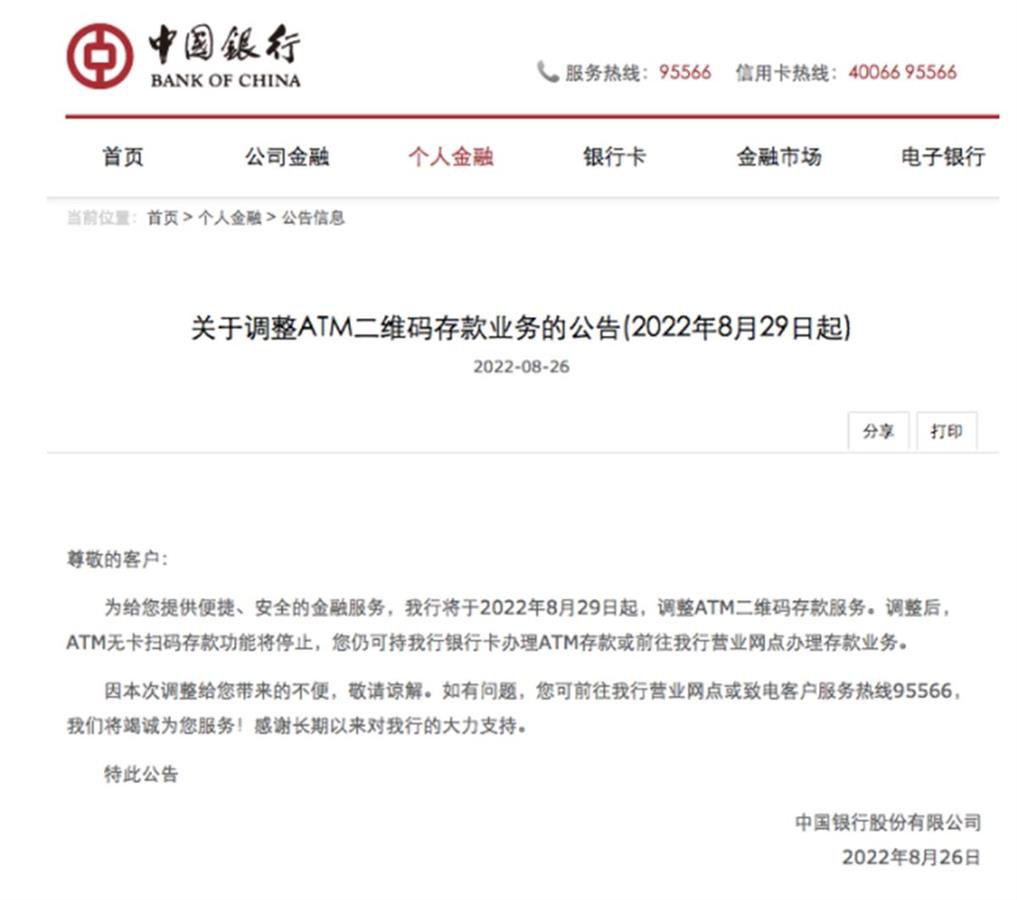 8月15日,中国建设银行也发布了关于停止ATM二维码存款业务的公告。建行称,自2022年8月19日起关闭ATM二维码存款功能,此后建行客户仍可持该行银行卡、选择无卡无折存款服务或开通“刷脸办”服务功能办理ATM存款业务。详见小坊之前的报道(突然宣布:建行停止这项业务!)