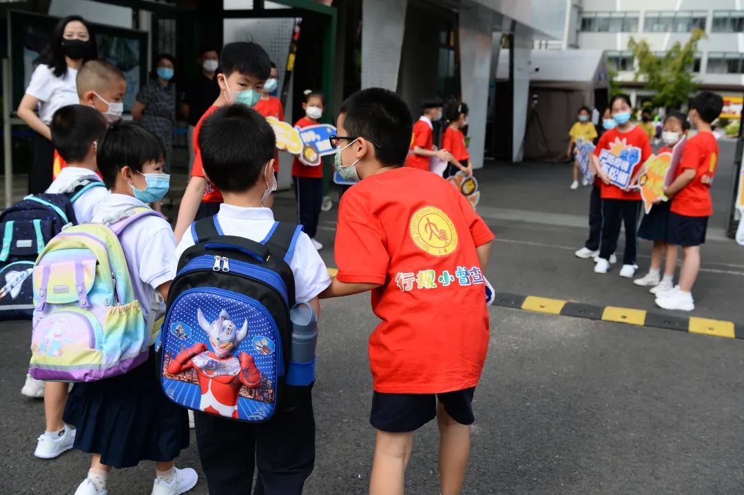 现场,还有一批身穿红色衣服的学生作为行规小督察员,为一年级新生做引导工作,避免门口聚集风险。