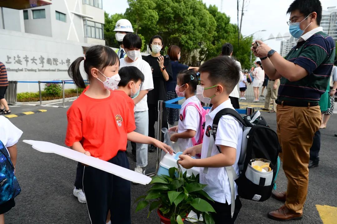 记者在大宁国际小学门口看到,一群身穿统一黄色T恤的三年级学生代表排成两列,举着写有“同学,欢迎你”“立志向,有梦想”的各式手牌,笑容满面地迎接着同学们的到来。