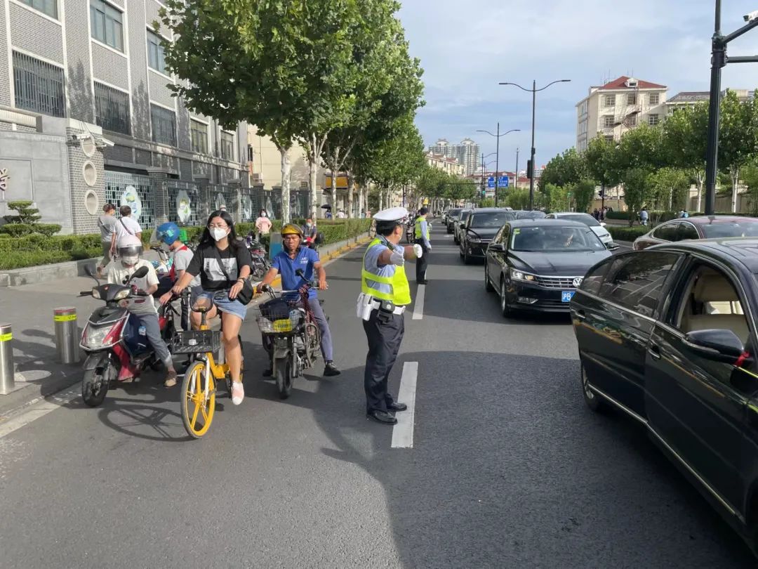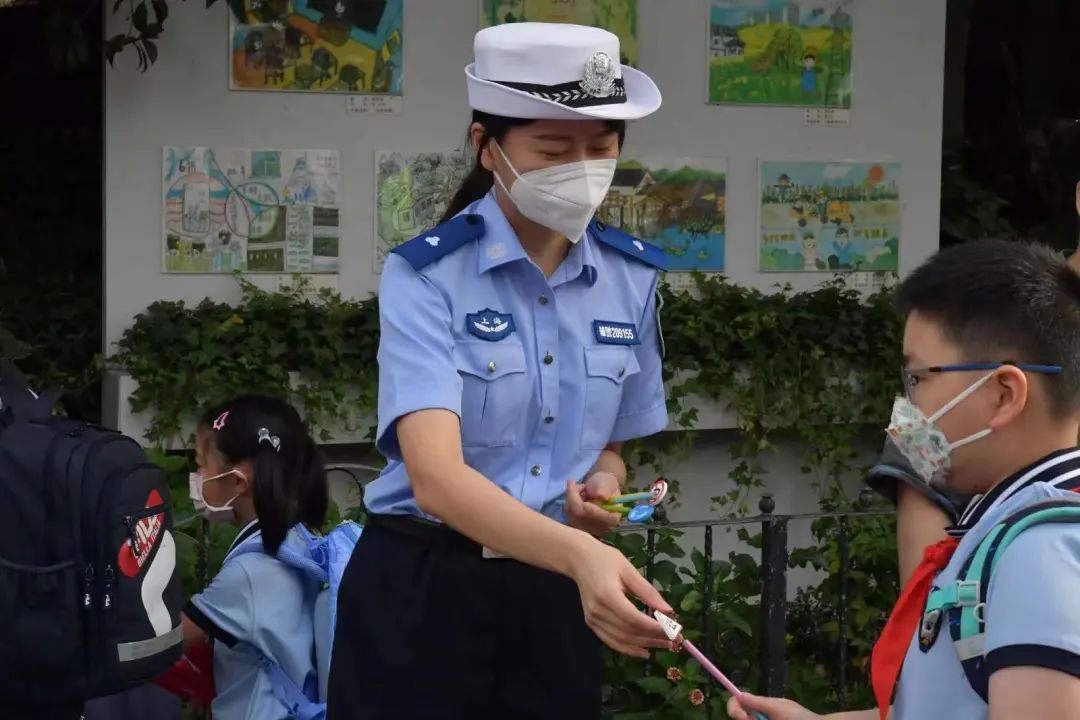 我们的主要任务是上学放学期间的护校,配合疏导现场秩序,提醒孩子们注意安全,比如走路慢行、戴好口罩、注意防护。