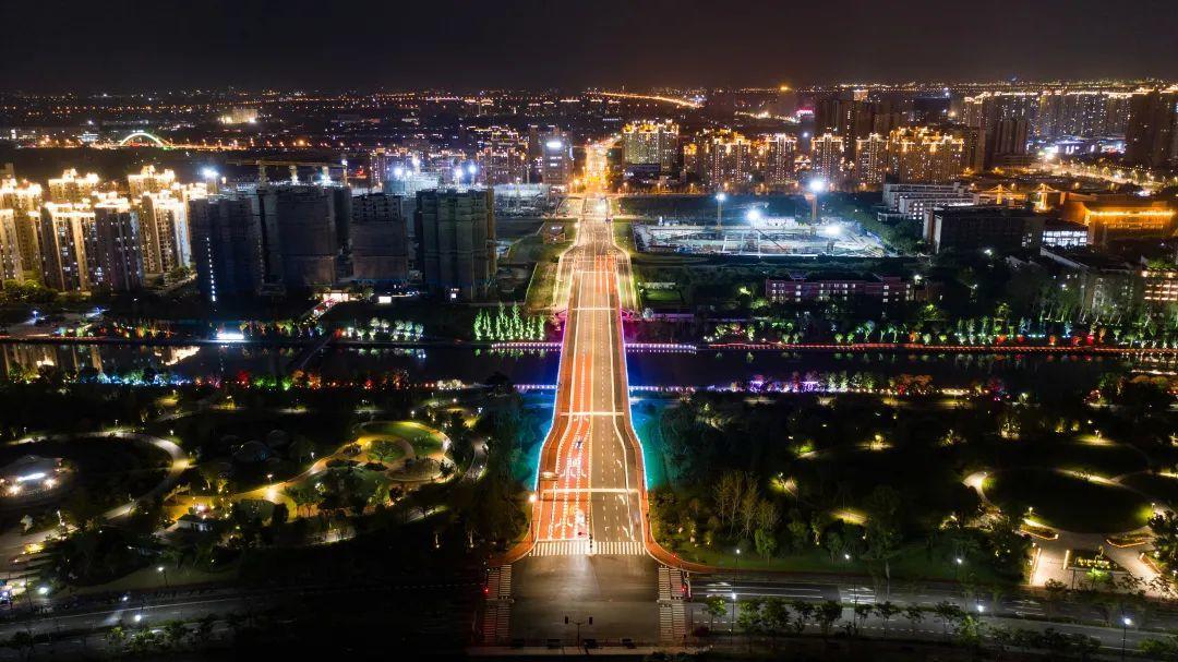 夜晚,开启景观灯后,桥面呈现多彩灯光变换,形成“万家灯火”点缀“十字水街”的效果,为上海之鱼的夜晚增添靓丽的风景。