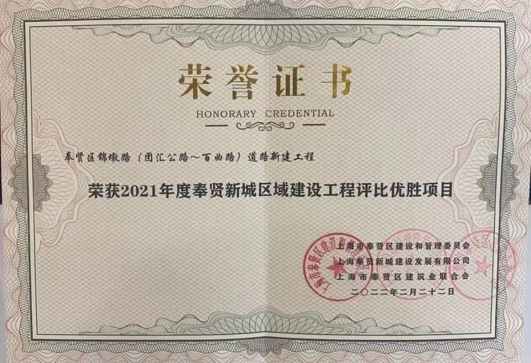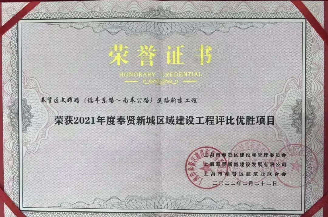 8月30日,在奉贤新城区域建设工程2021年度评比表彰会上,由奉贤新城公司下属新贤公司建设的文耀路(德丰东路~南奉公路)道路新建工程和锦墩路(团汇公路~百曲路)道路新建工程荣获2021年度奉贤新城区域建设工程评比优胜项目。