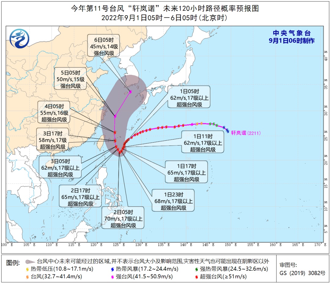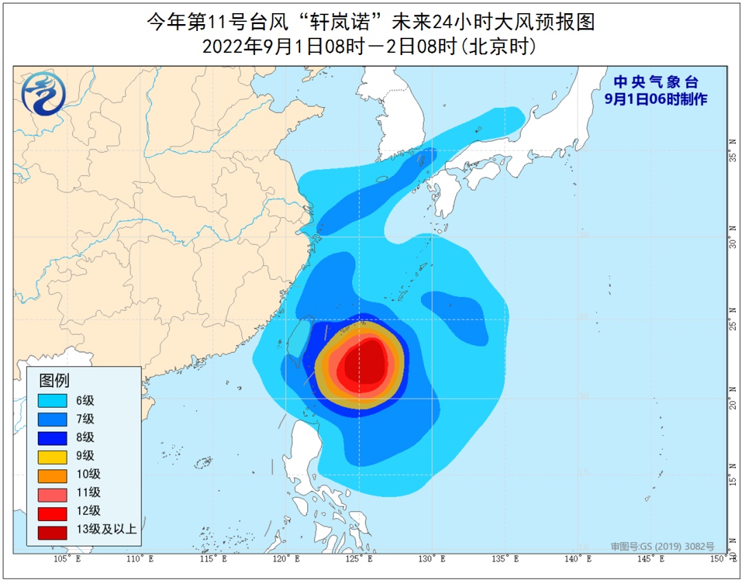 大风预报:9月1日08时到9月2日08时,受“轩岚诺”和冷空气的共同影响,东海大部、台湾海峡、巴士海峡、台湾以东洋面,以及台湾岛沿海、福建沿海、浙江沿海、上海沿海、江苏南部沿海、长江口区将有6-8级大风,阵风9-10级;其中台湾以东洋面的风力将有9-12级,阵风13-15级,台风中心经过的附近海域或地区风力可达13-17级,阵风17级以上。