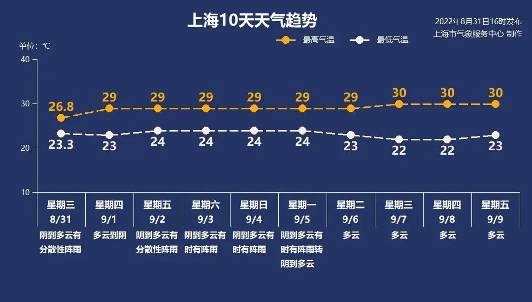 6日起,台风“轩岚诺”远离,上海以多云天气为主,气温稍有回升,最高气温在30℃附近。