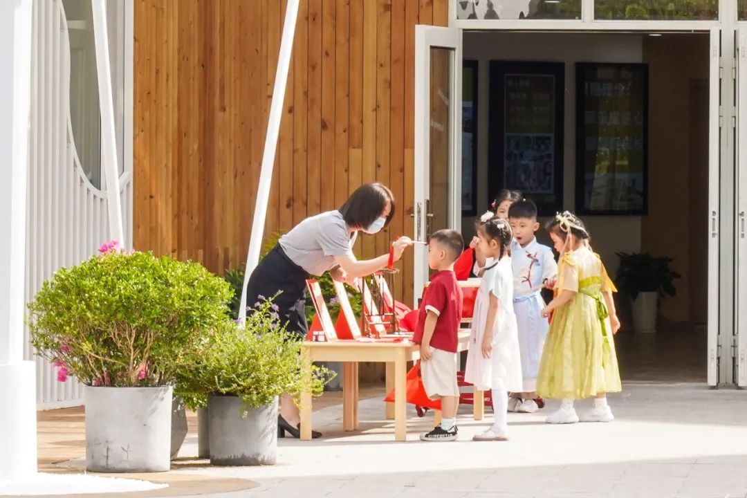记者注意到不少萌娃和老师都身着汉服,仪式感满满地踏入校园。“开学很开心,早上妈妈帮我用口红在额头上画了一个小手印的图案,奶奶给我准备了裙子,打扮得很漂亮。”小朋友彭欣瑶说。进入校园,学校还设置了朱砂启智、击鼓传智、开笔添智的小仪式,为孩子们送上真挚美好的祝福。