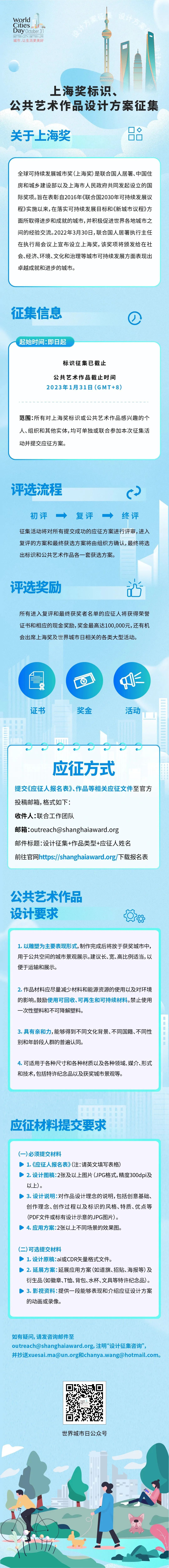 为满足公众参与热情,征集更多优秀作品,提升作品质量,经活动组织方研究决定,上海奖公共艺术作品方案征稿截止日期将由2022年8月31日延长至2023年1月31日,欢迎大家持续关注并积极投稿!