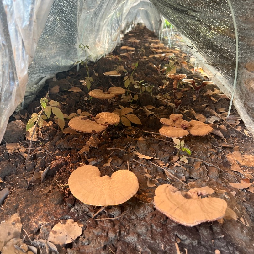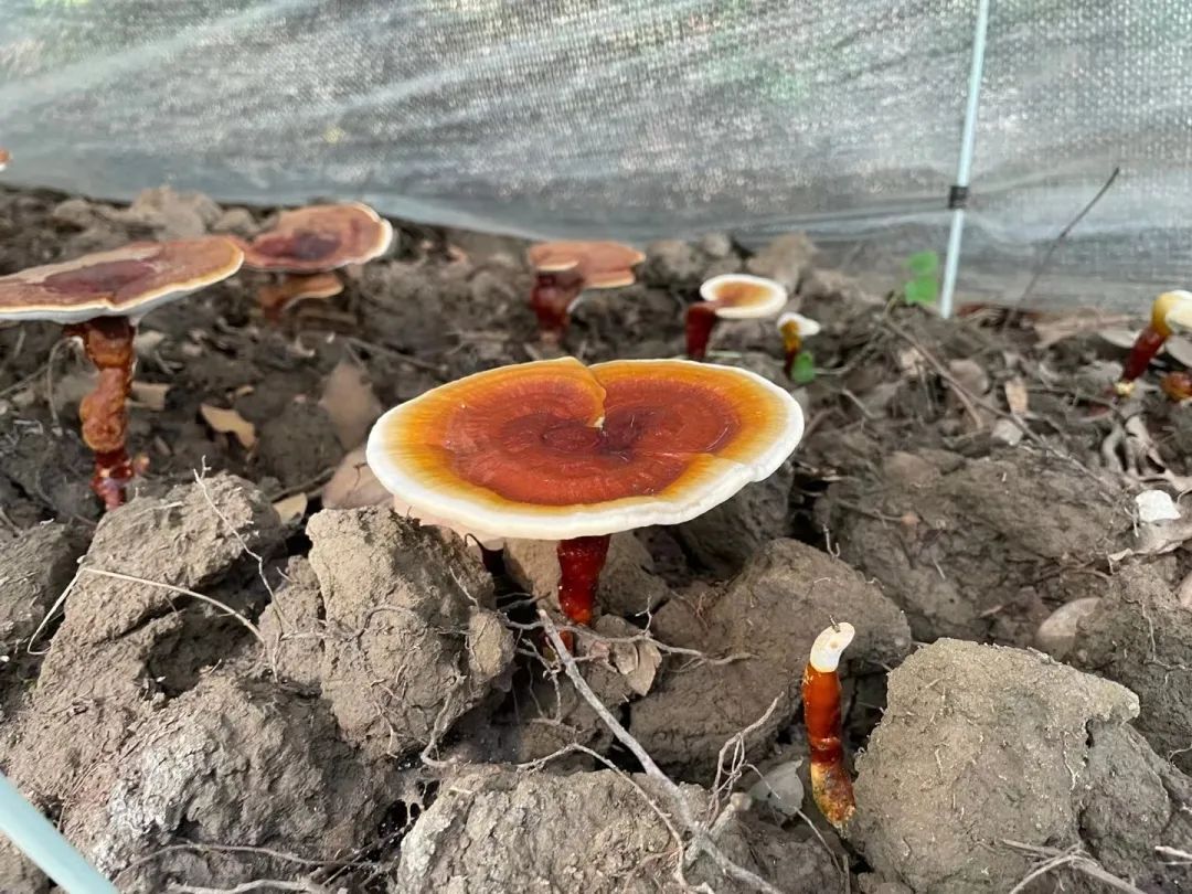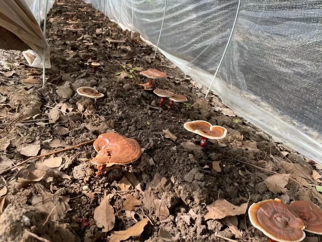 五宅村“农科英才”李正鹏老师联络村委会和灵芝菌包生产基地,组织生产灵芝菌包,采用了液体菌种接种的方式进而缩短灵芝发菌周期。因今年持续的高温天气,故采取了先将菌包覆土适应外界环境而不割口的方式。菌包栽培适应了7天后,割口准备出菇。半月后小拱棚内一个个小灵芝原基都冒头了,随后采取了高湿焖棚的方式,让小灵芝原基长高。直至7月中旬,灵芝逐步开篇长大,极端的高温天气,烤断了多根用于拱棚支撑的玻璃纤维支架,却孕育了小棚内婀娜多姿的灵芝。