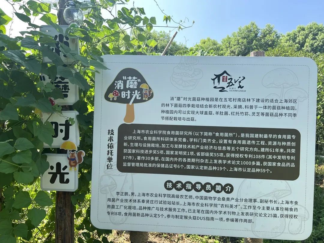 消“蘑”时光菌菇种植园是在五宅村南店林下建设的适合上海郊区的林下菌菇四季栽培结合新农村观光、采摘、科普于一体的菌菇种植园。种植园内可以实现大球盖菇、香菇、杏鲍菇、灵芝等菌菇品种不同季节搭配栽培与出菇。