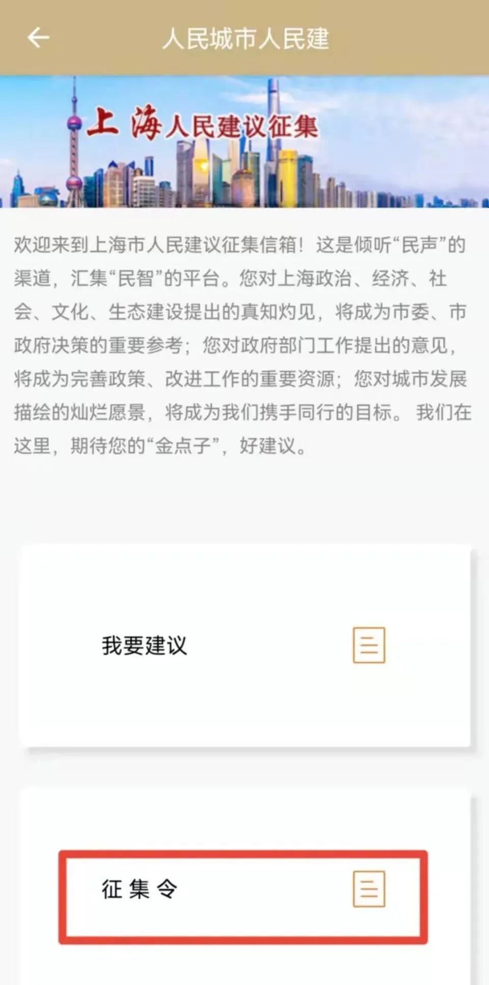 2、登录“随申办”APP,点击「互动」—「人民城市人民建」—「征集令」—「我为杨浦滨江献一计」—「我要建议」。
