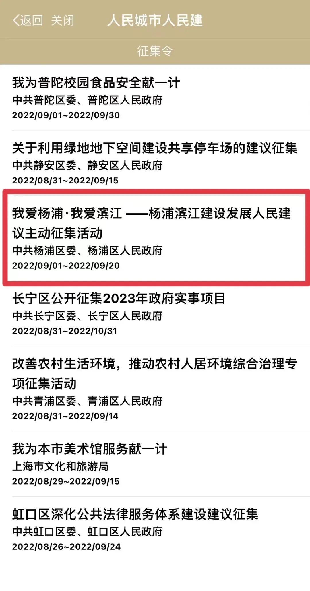 杨浦滨江改造发展离不开人民群众的支持与鼓励。您的“想法”有机会融入建设蓝图,您的“金点子”有可能结成发展的“金果子”。杨浦滨江的建设,期待您的共同参与~