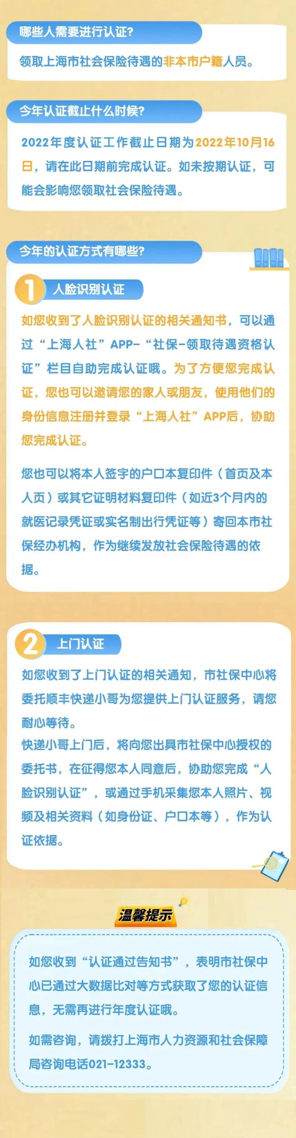 市人社局提示,上海市2022年度领取社会保险待遇资格认证工作已经启动。市社保中心已于近日向需认证对象寄发《领取社会保险待遇资格认证通知书》,请在2022年10月16日前完成认证,以免影响领取社会保险待遇。详见↓