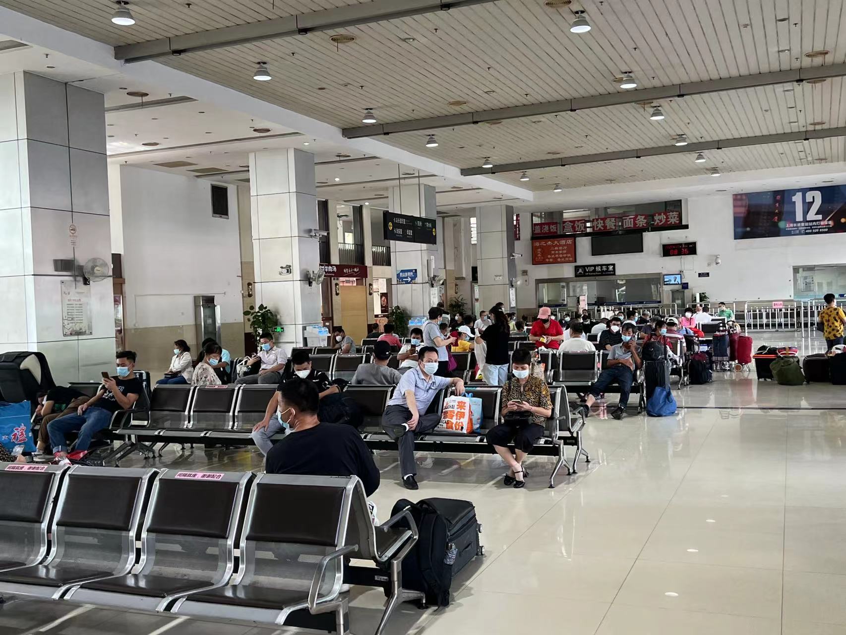 上午早高峰时间,长途南站的停车场上进出车站的车辆并不多,候车大厅里正在候车的旅客也仅占了大厅的三分之一左右,旅客们都戴着口罩,安静候车。取票处进行取票买票的旅客寥寥无几,检票口旅客排队有序,并不拥挤。
