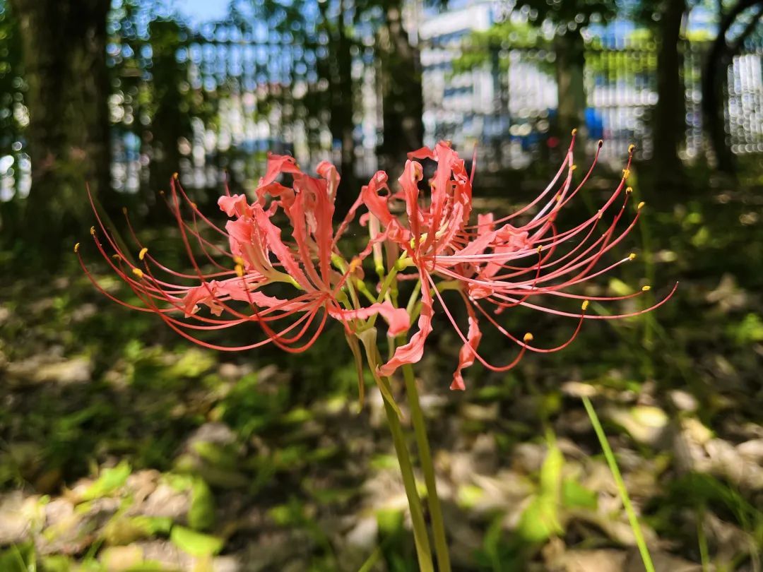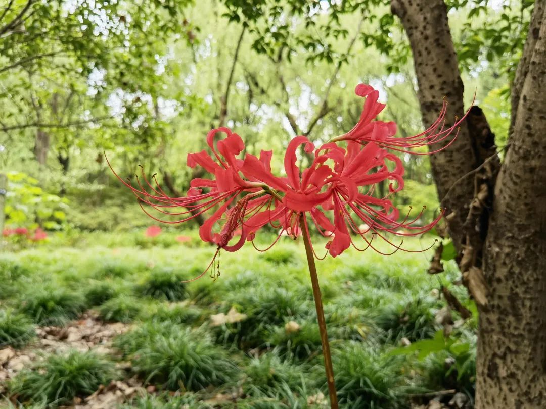 康健园内石蒜花开正艳,绯红的花朵张扬又热烈,向过往游客展现饱满的风姿。“花开不见叶,叶生不见花。”是石蒜生长习性的典型写照,因此又被唤为“彼岸花”。