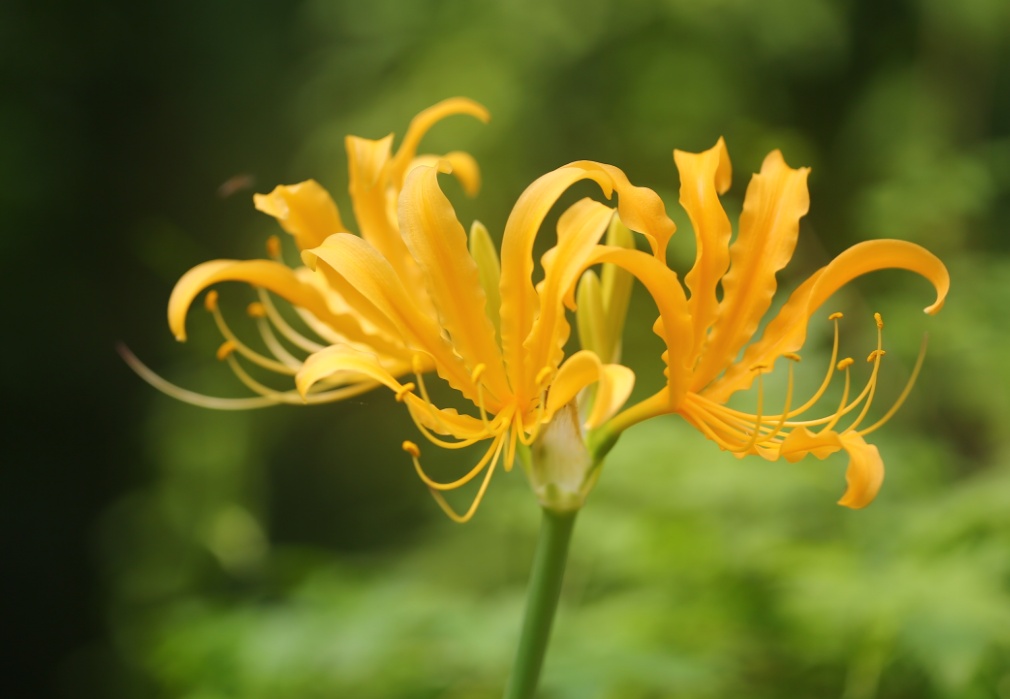 忽地笑与彼岸花同为石蒜科、石蒜属,花型十分相似,因此常常被人误以为是彼岸花,又有“黄花石蒜”的别名。“蟹爪丝瓣竞缠绕,彩团绣球韵独稀。终日缄口暗蓄势,秋来涣涧笑满川。”这句诗描绘的可谓入木三分,倔强的的花茎如玉剑般破土而出,没有一片叶子作陪,如蟹爪般的丝状花瓣,似一个玲珑剔透的镂空绣球,飘逸飞扬。