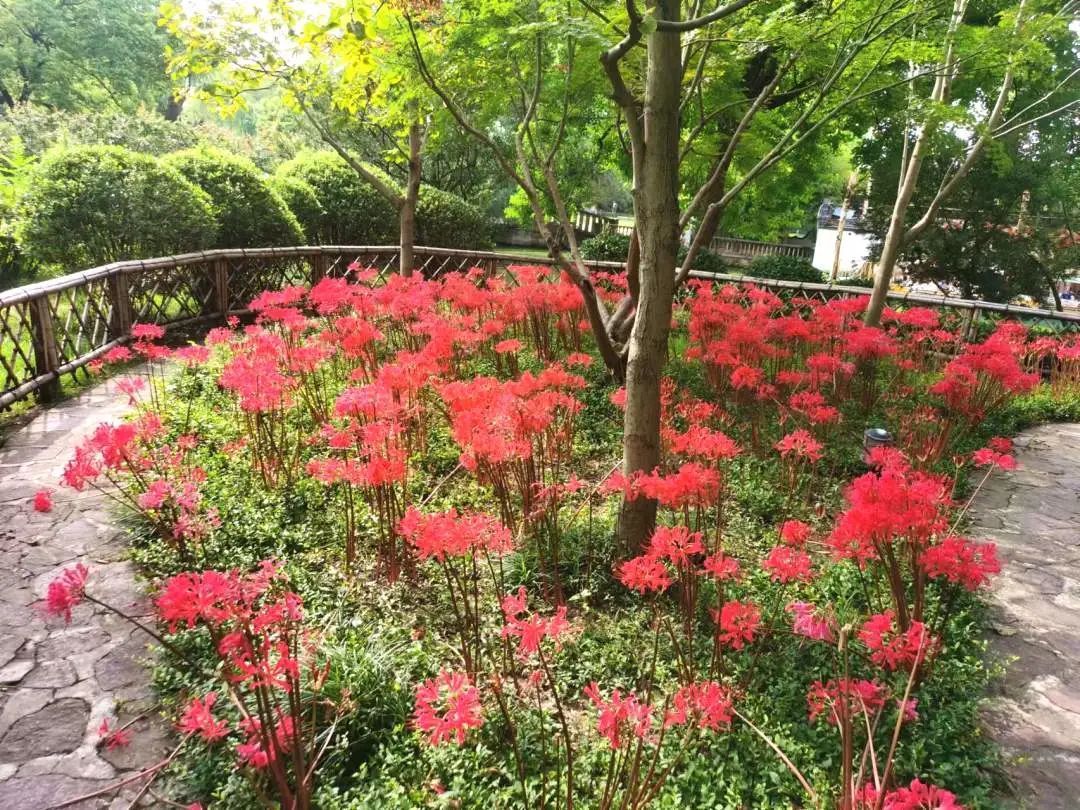 古猗园里的墙角隅 、林荫下、石头缝里,窜出了一丛丛火焰般的彼岸花,惊艳了时光。