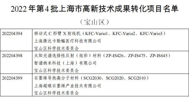 日前,上海市科委公布了2022年第4批上海市高新技术成果转化项目名单,其中,宝山区有上海康达卡勒幅医疗科技有限公司的移动式C形臂X射线机项目、智谱纳米科技(上海)有限公司的太阳光谱选择性反射(炫彩)材料项目和上海超碳石墨烯产业技术有限公司的石墨烯导热高分子材料项目,这3个项目入选,3家公司均入驻于宝山高新区内。