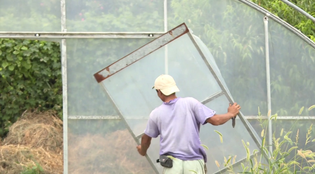 在沿海的奉贤海湾旅游区,果农们正在为防台做准备,提前采收完露天区域的成熟水果和农作物后,再给不需要保温的大棚撤掉塑料膜布,并为有膜布保温的大棚绑上弹力绳、加固大门和框架,疏通水流管道……