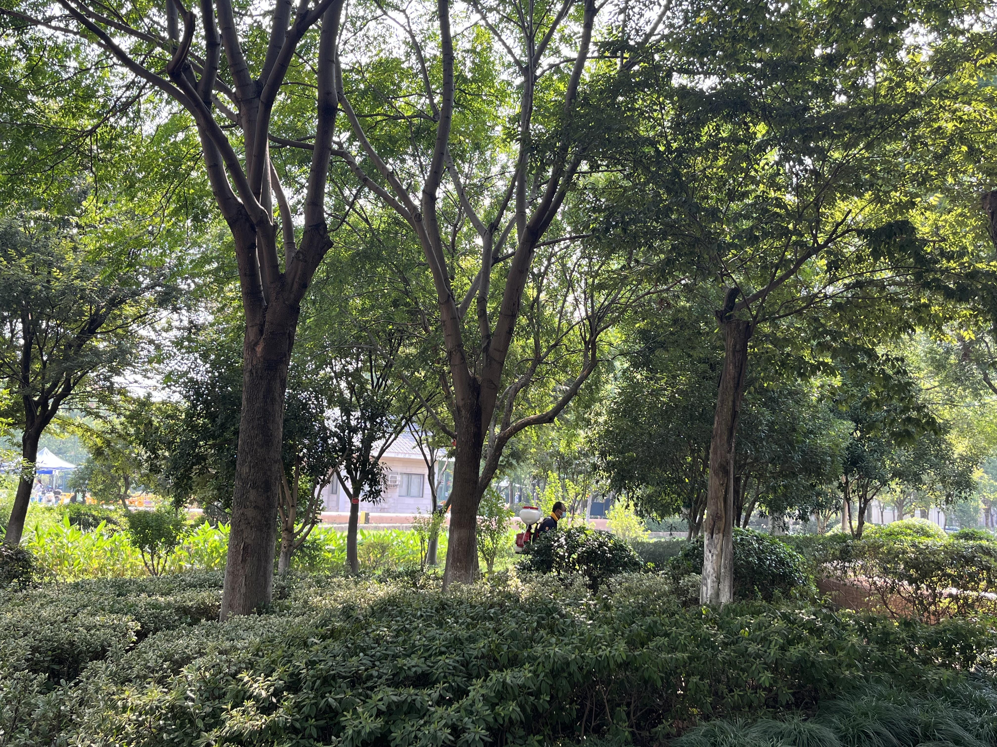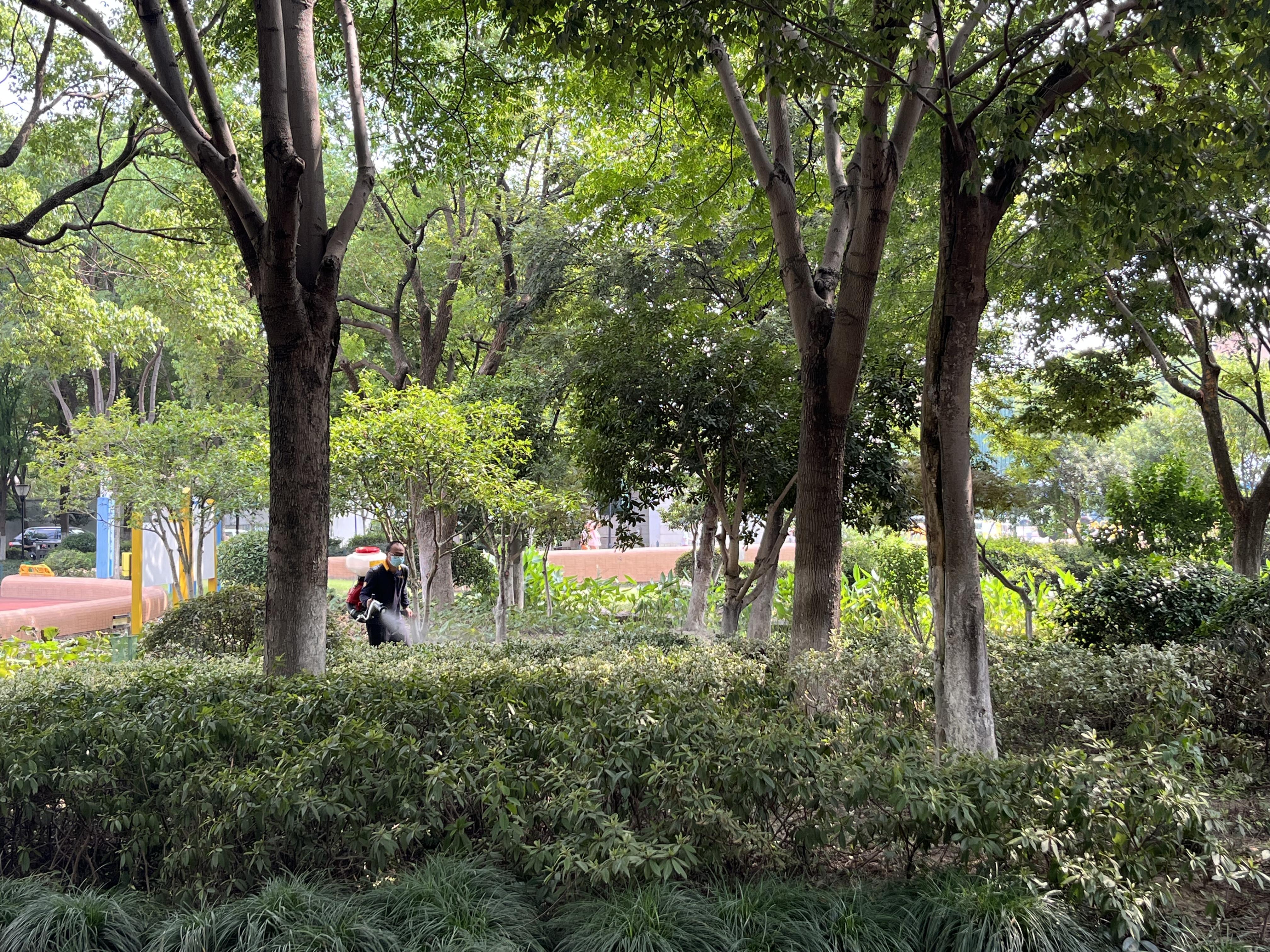 防治员背着喷雾打药机现在公园绿化带四周喷洒,随后又走到绿化带深处角角落落逐一消杀。由于公园内还有市民游玩,工作人员主要在绿化带深处作业。