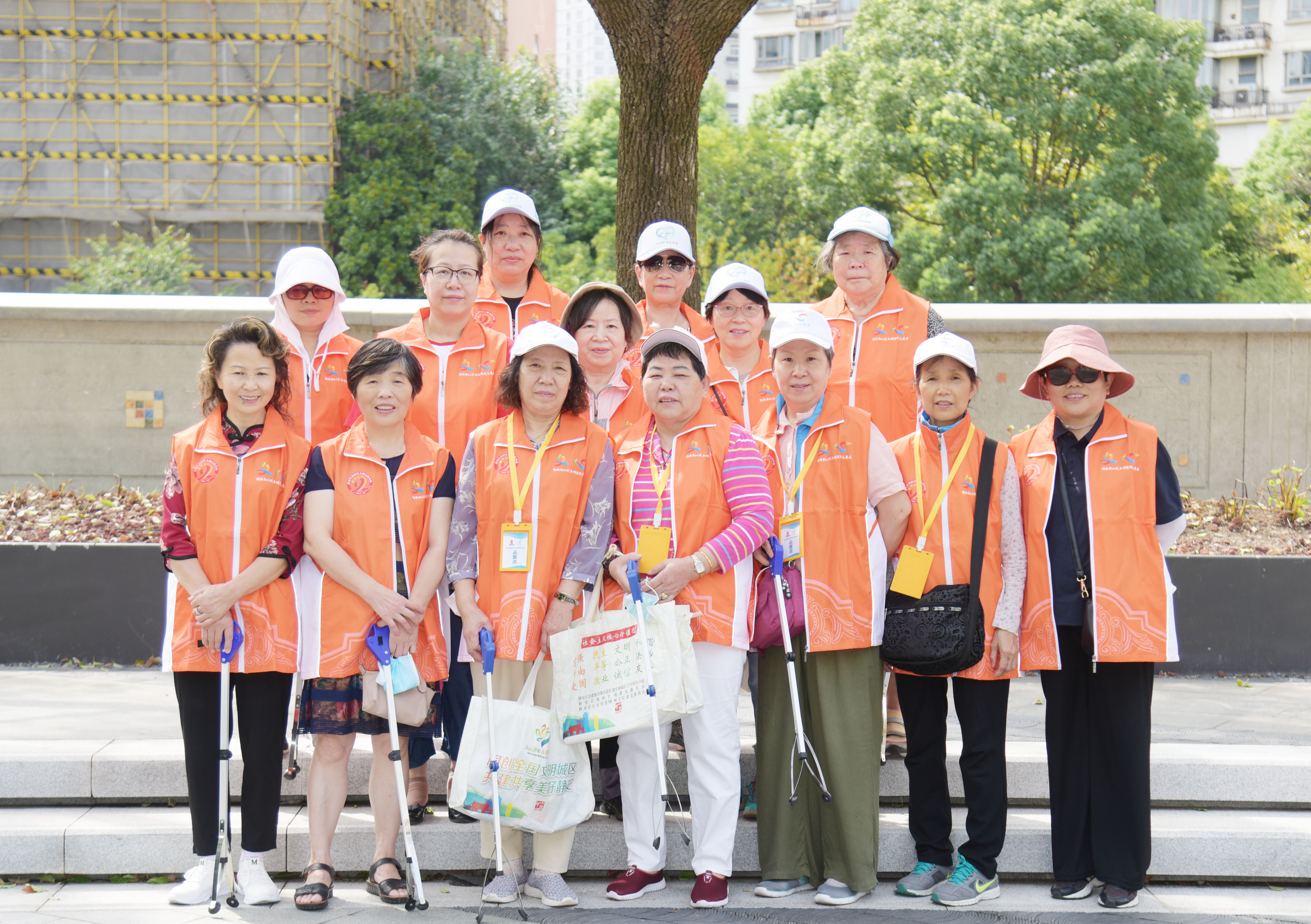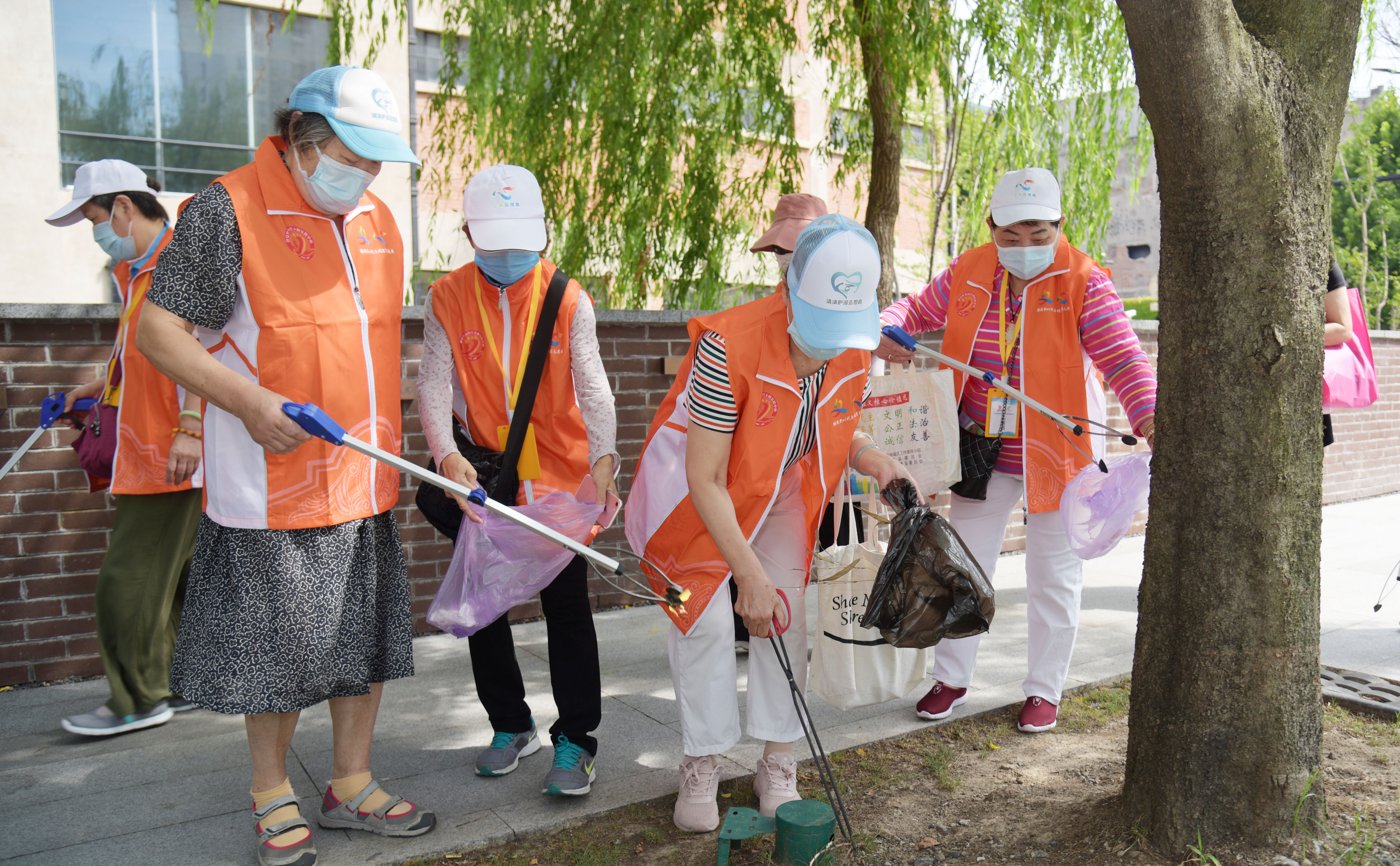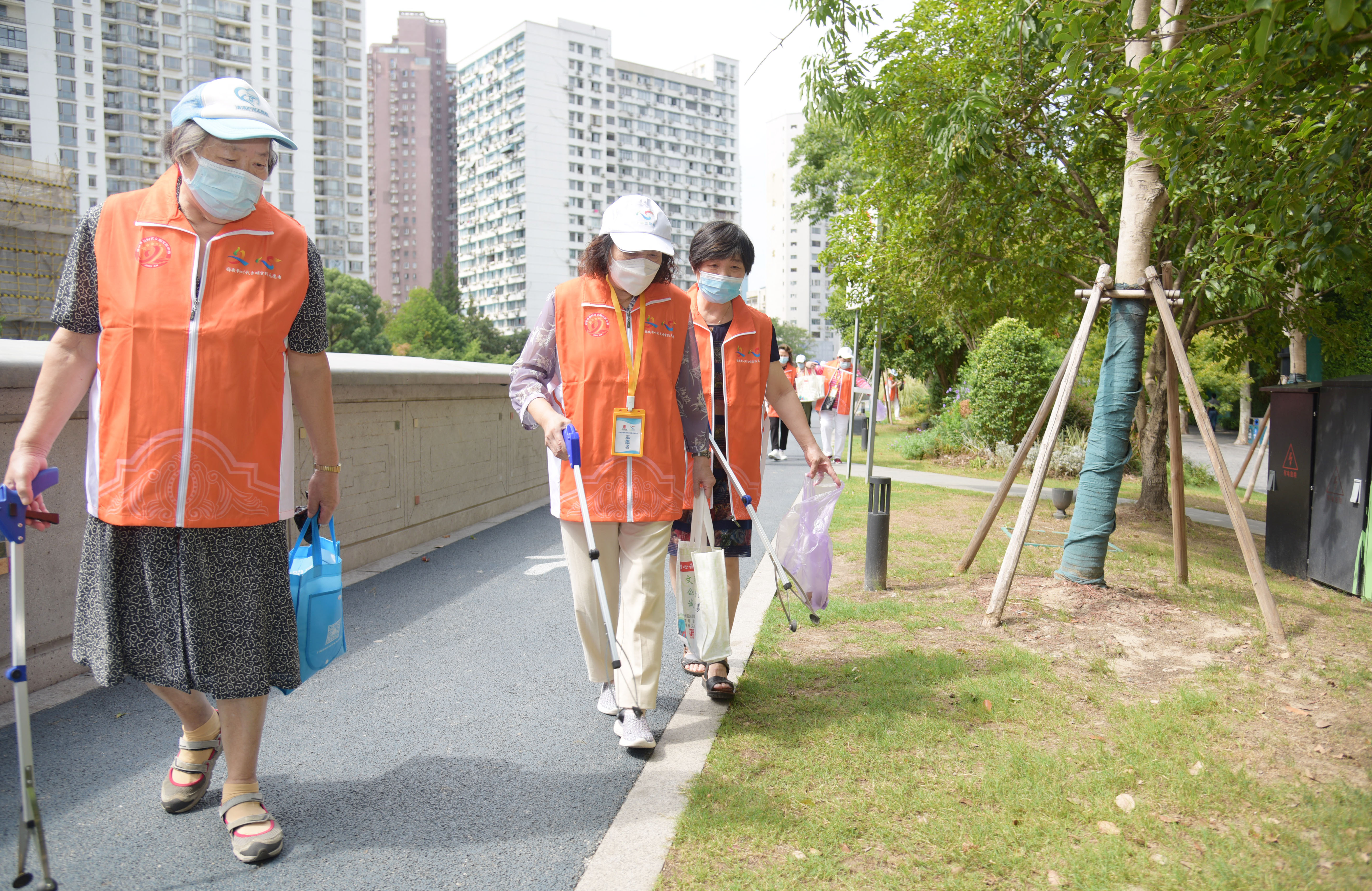 护河队的志愿者们穿着志愿马甲、拿着钳子、垃圾袋等专业工具,以社区志愿服务中心为出发点,分为两组,沿着北苏州路绿化带开始巡查。