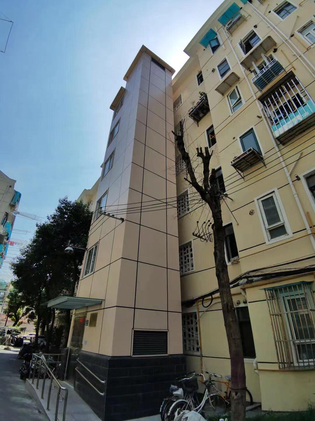 在打浦街道,北蒙三小区41、42号楼的建筑形式较为特殊,一个自然幢由2个门栋对称组合,成“回字型”结构,外墙均为居民窗户,没有加梯空间,在多次可行性排摸中均被列在“不适合加梯”的范围内。但楼内老龄人口比例高,人口多,对电梯的使用极为迫切。作为上海首例内天井加装电梯,无前期经验可借鉴。为此,区房管局与街道会同市房管局安监所、市房屋质量检测中心、区规划资源局、区民防办、加梯代建单位、设计单位召开多次协调会,针对方案设计群策群议,在专家指导下量身定制电梯尺寸、全面勘查内天井管网,逐一破解技术难点。同时,采用传统人工模式,挖基坑、吊钢材、搬机械,千方百计克服空间限制。最终,在施工单位纯人工作业下,历时近半年时间,终于完成了全市首台内天井加梯。