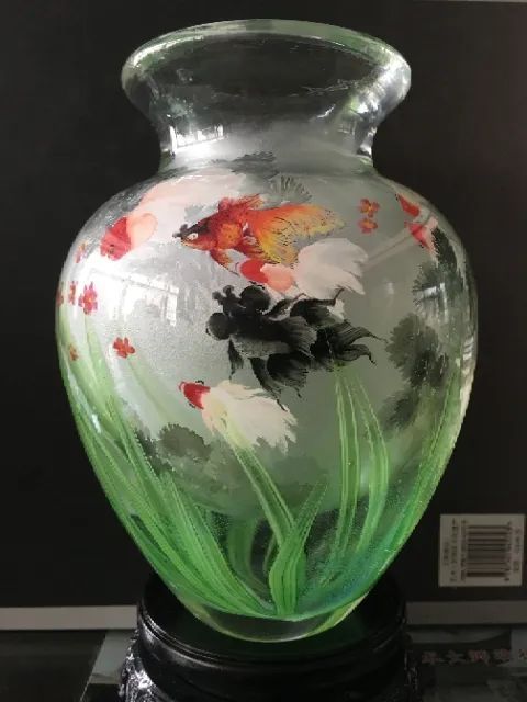 这件作品用烧制技艺把水草的形象表现在水晶瓶外,再用内画的精湛技艺绘制出大小不同、颜色各异的金鱼,既体现了琉璃的绚丽,又展现出内画的精湛。古墩瓶型底部圆阔、上部细窄,形似钱袋,象征财富、财运、圆圆满满。整件作品寓意平安富贵,事业进取、平稳。