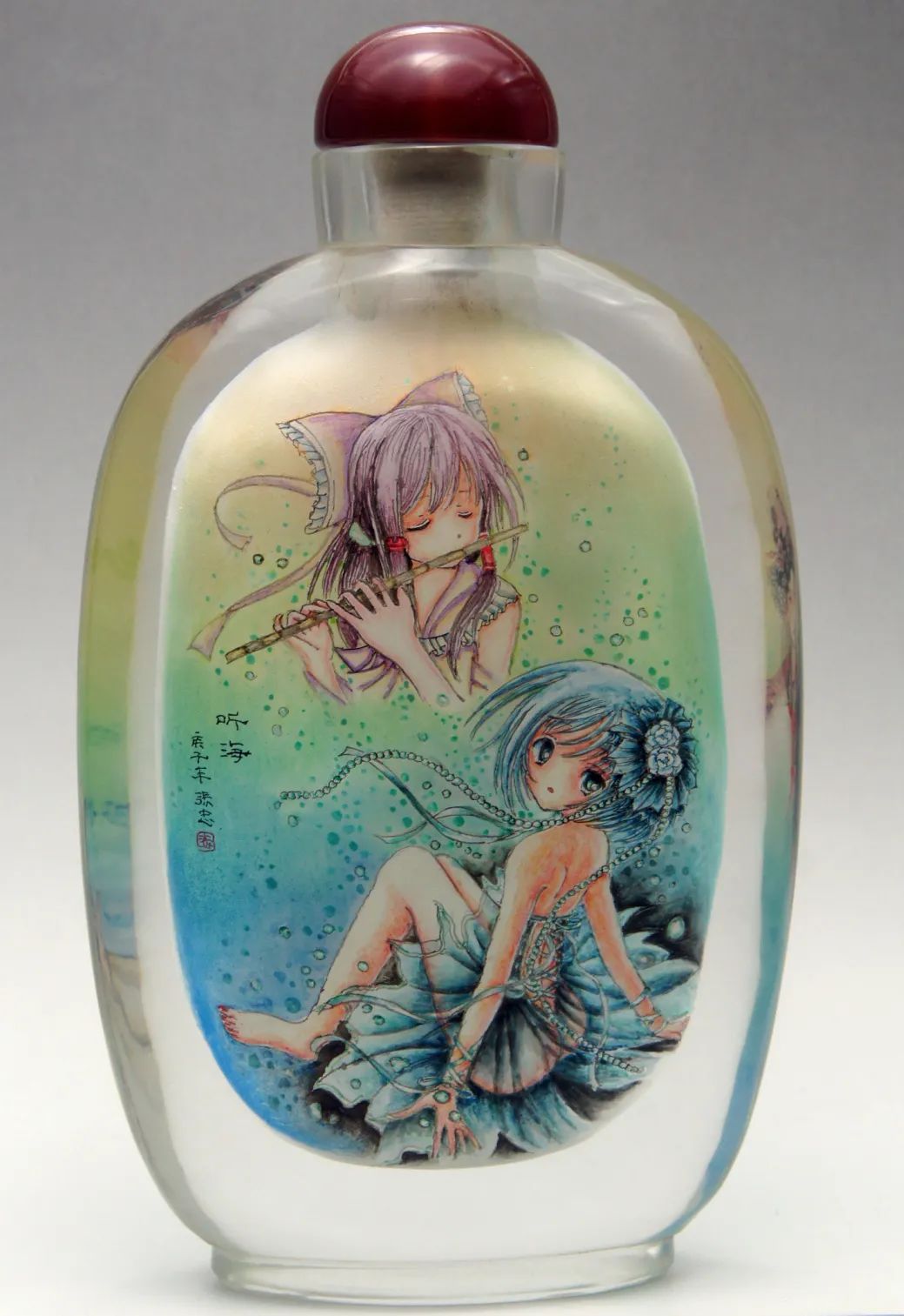 据了解,文静的丈夫张鹏也是中国内画艺术大师,同时是中国琉璃艺术大师,将水草的造型融入到瓶身的设计,就是文静与张鹏共同讨论、反复试验出来的。